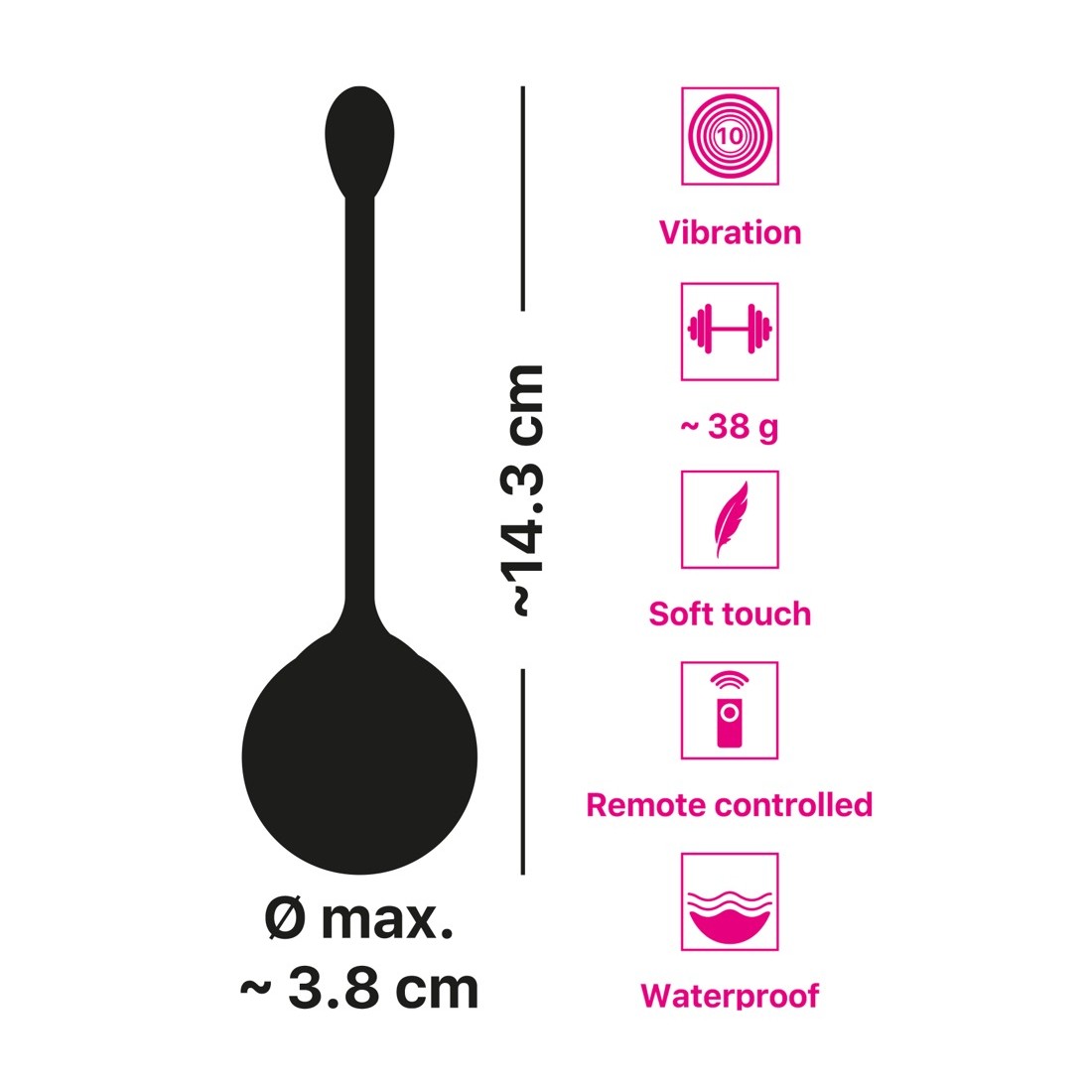 Con un peso di 38 g, questa palla vibrante è perfetta per un allenamento vaginale iniziale. Realizzata in silicone skin-friendly con una texture morbida e setosa al tatto, la palla è facile da inserire e fornisce il massimo comfort per l'allenamento/le coccole.