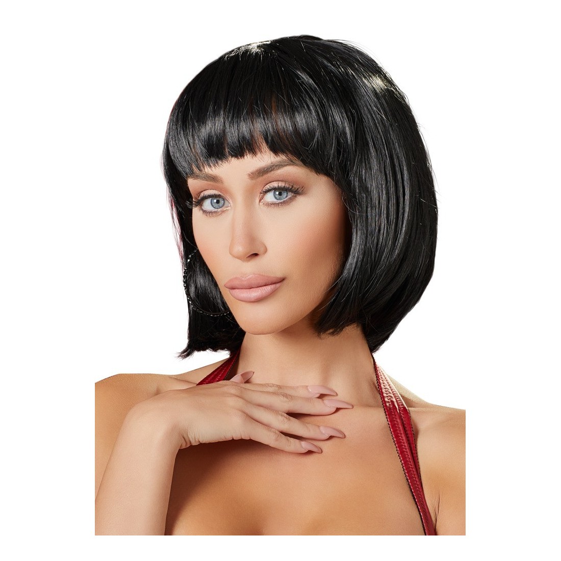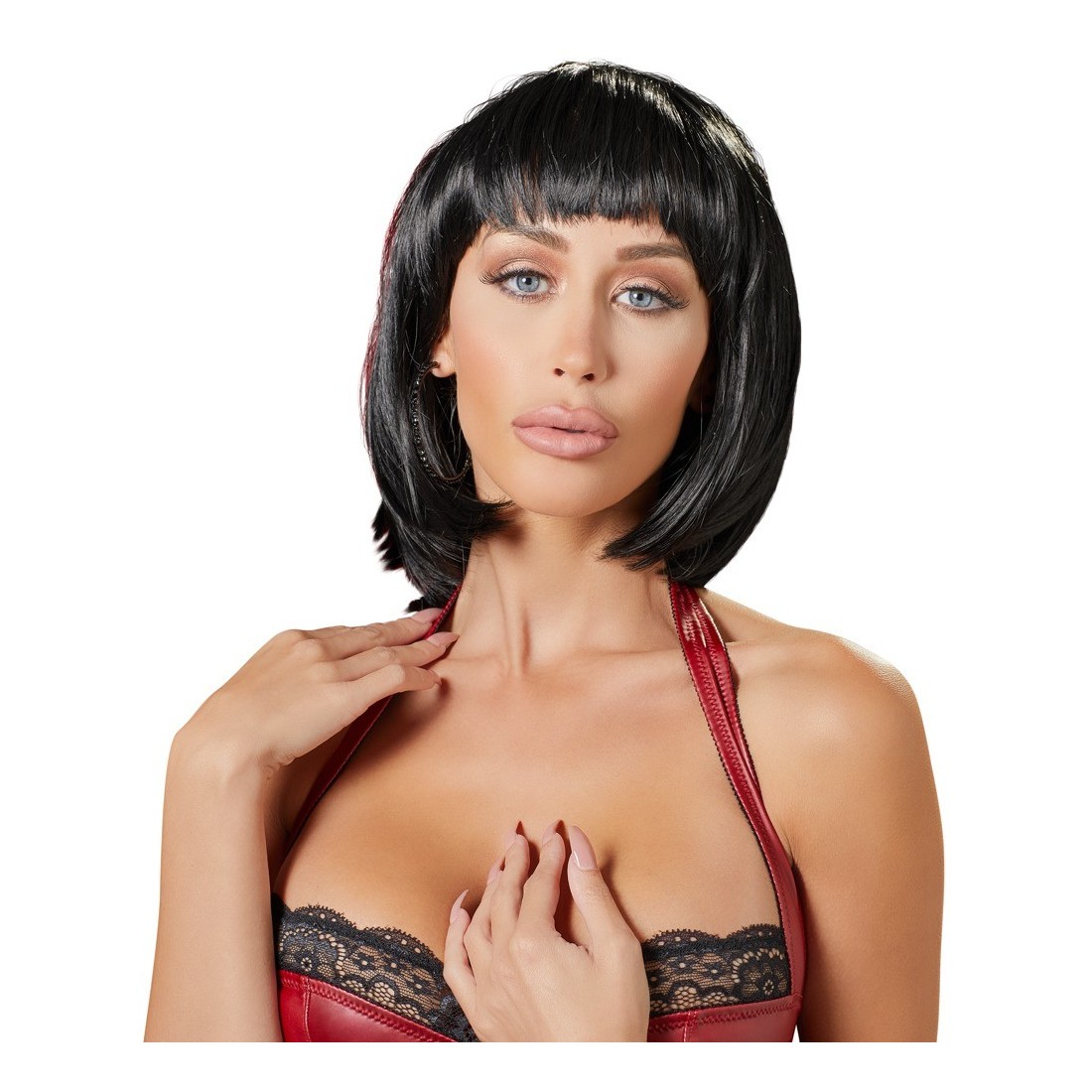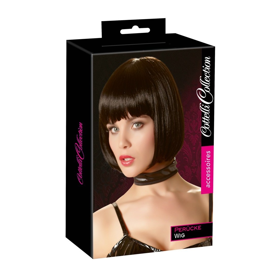 Parrucca con capelli artificiali accuratamente lavorati facile da lavare con acqua e shampo (possibilmente con uno shampo speciale per parrucche). Un po' severa ma molto elegante! Caschetto lunghezza mento con frangia. Nero. Materiale: 60% fibra PVC 40% modacrile. Avvertenza.