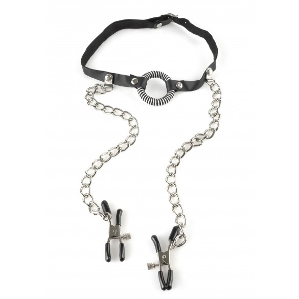 Gag O-Ring con Morsetti per capezzoli. Il morso gag costituito da un anello piccolo in metallo rivestito in pelle collegato a due robuste cinghie di cuoio. Due morsetti per i capezzoli con catena e le pinze rivestite per adattarsi facilmente alla vostra misura.