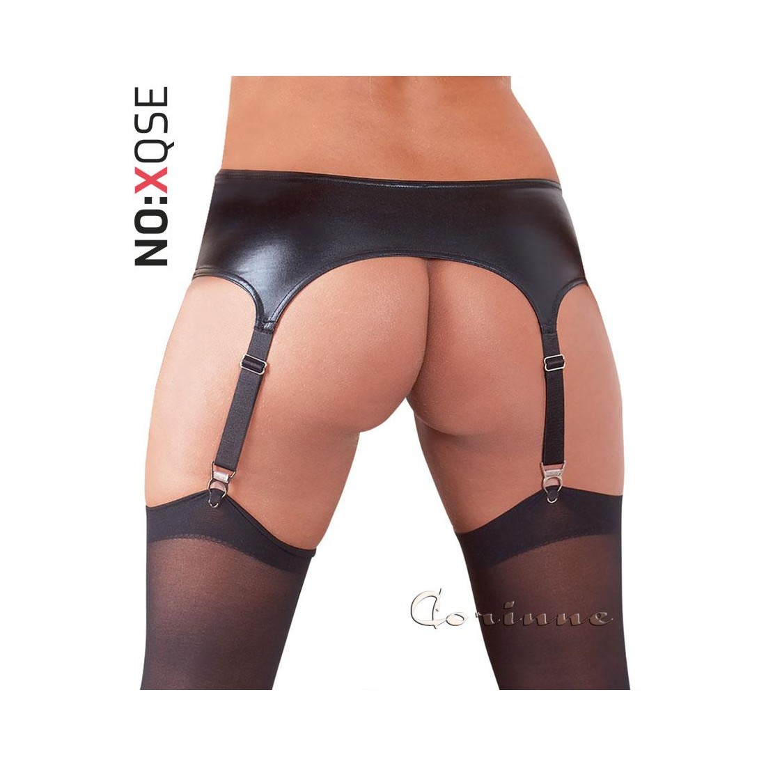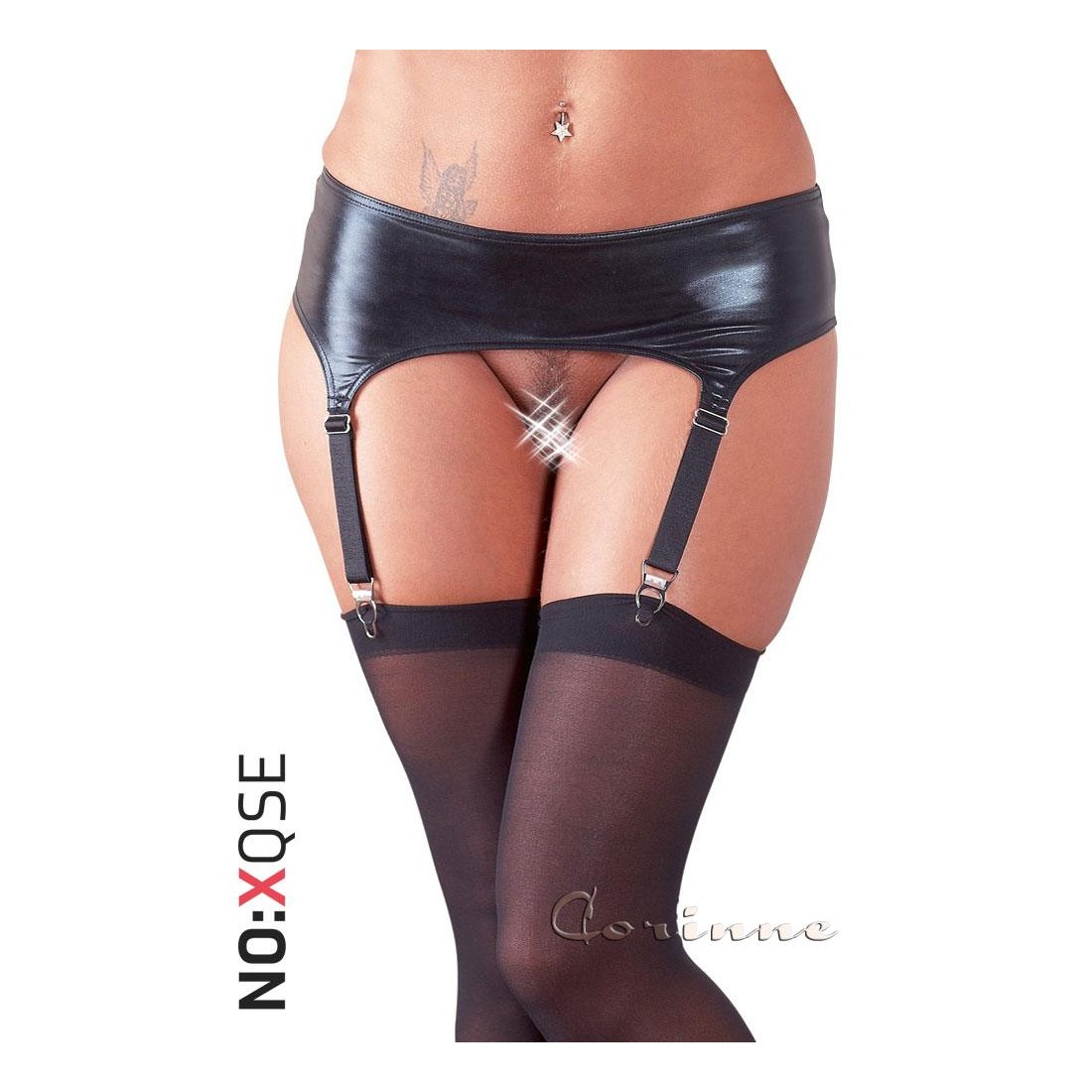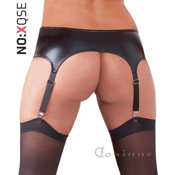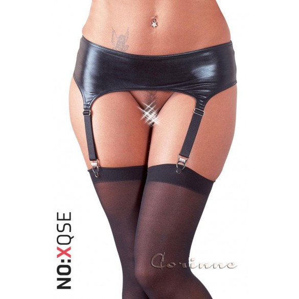 Reggicalze in tessuto lucido nero elasticizzato comprendente un paio di calze nere velate.