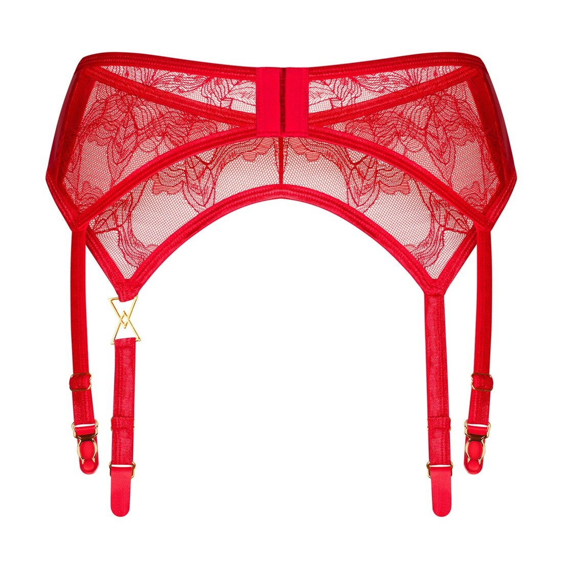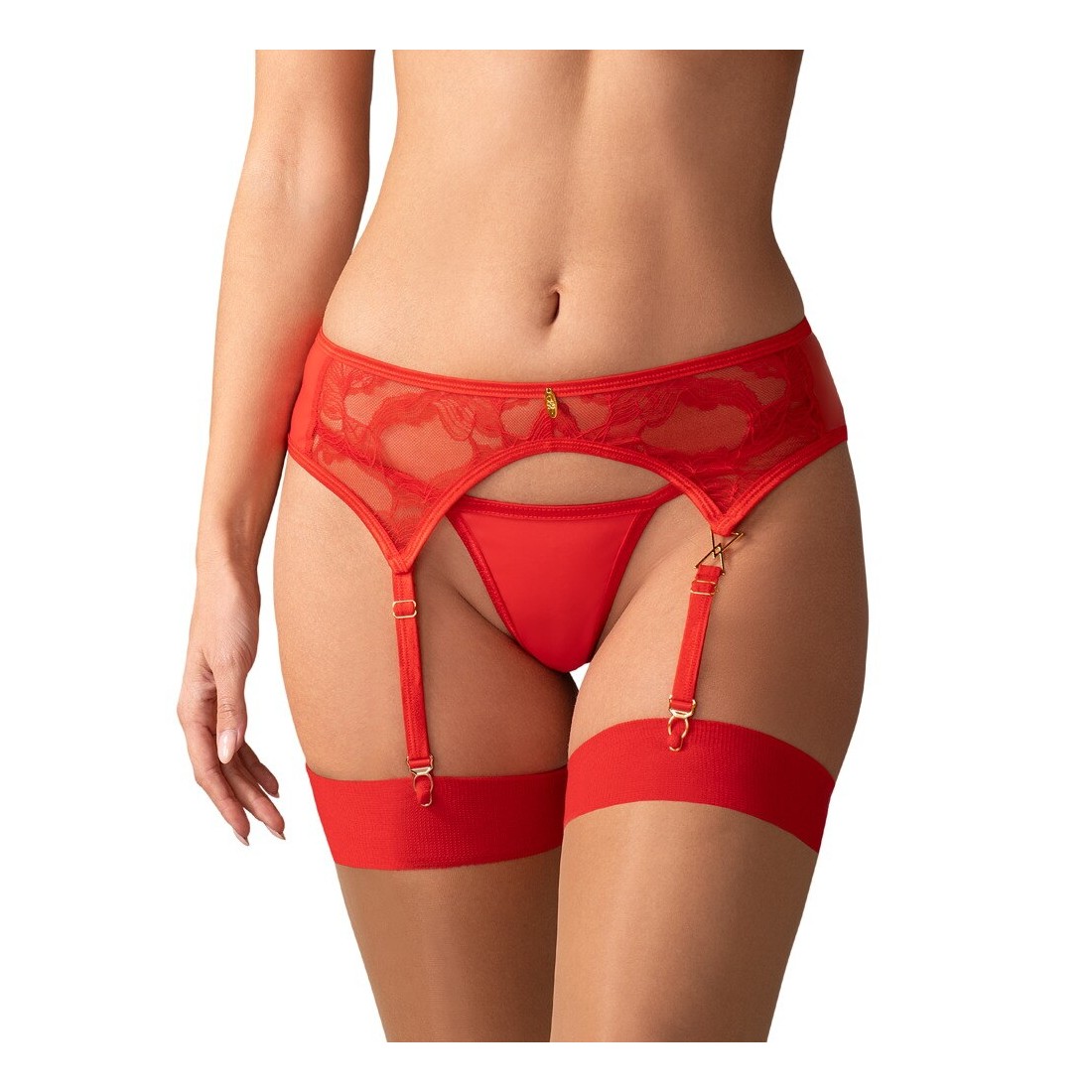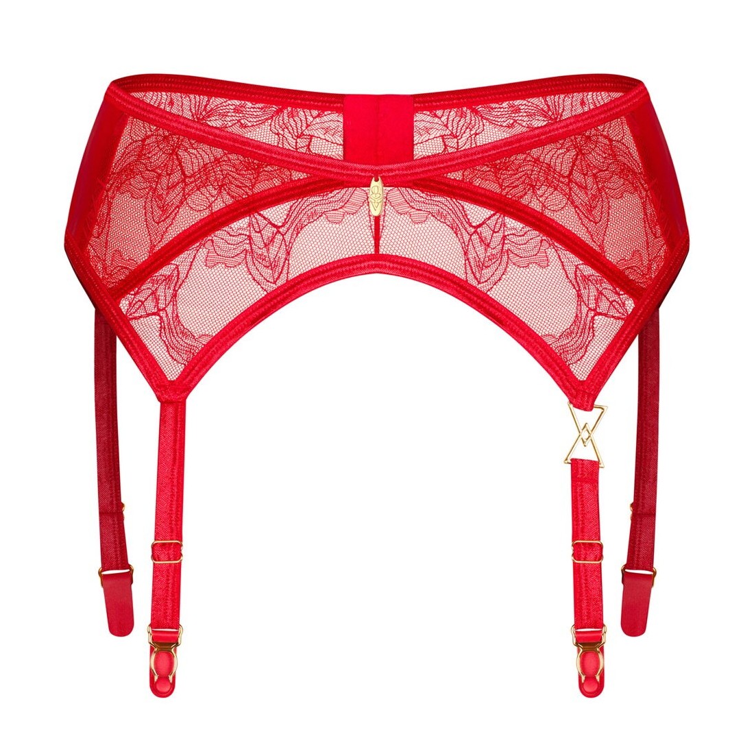 Bellissimo reggicalze Aliosa by Obsessive in rosso sensuale, realizzato in pizzo floreale morbido ed elastico. Con dettagli decorativi color oro sulla cintura e su una bretella. Le bretelle e la chiusura a gancio sul retro possono essere regolate per adattarsi.