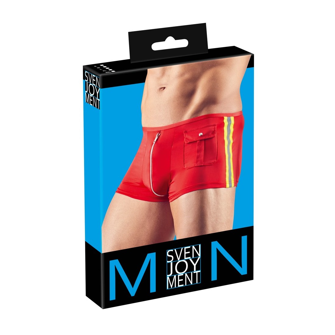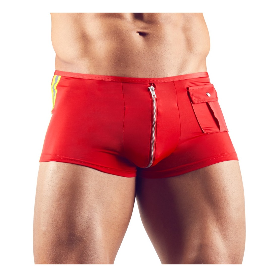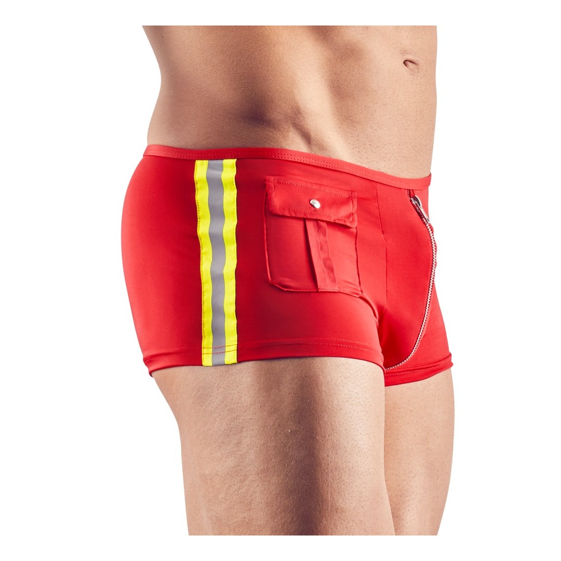 Pantaloni rosso vivo in look da pompiere per un gioco di ruolo fantasioso. Con strisce riflettenti, tasca decorativa e cerniera intelligente sul davanti. Inoltre, la funzione swell fornisce un impressionante rigonfiamento anteriore.