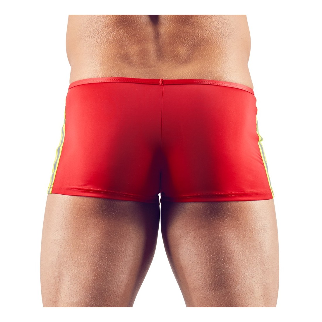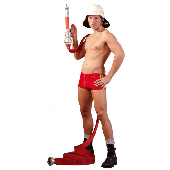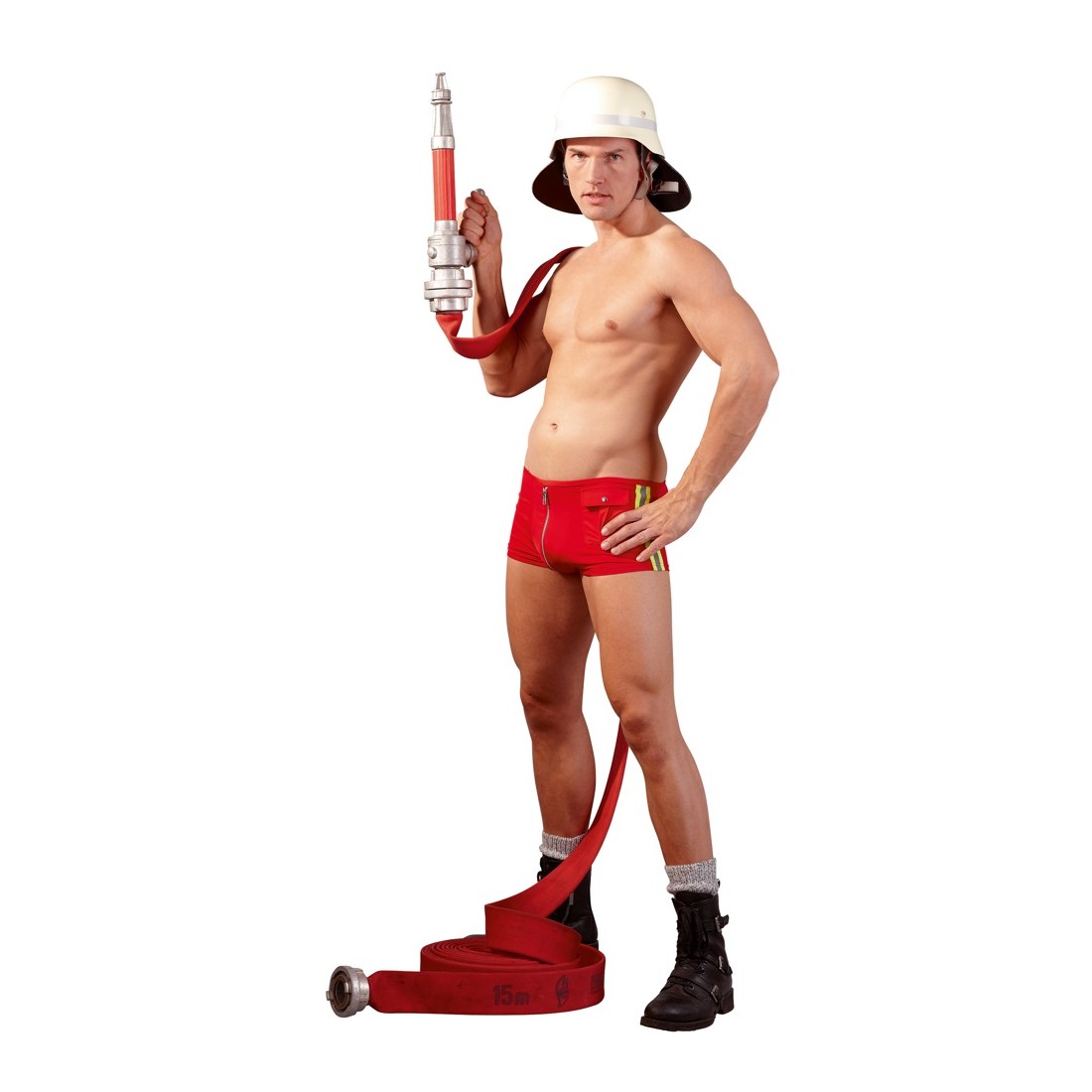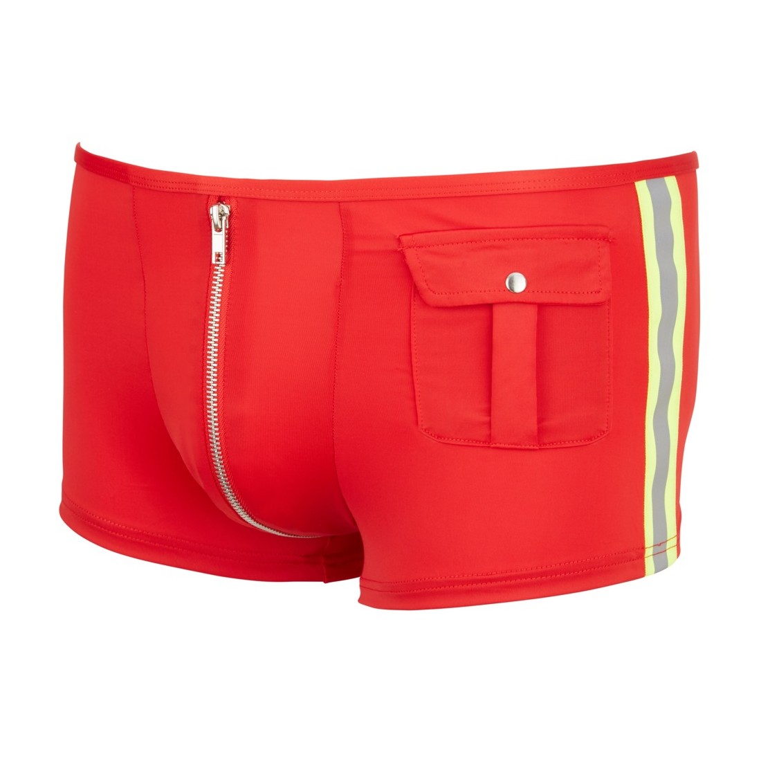 Pantaloni rosso vivo in look da pompiere per un gioco di ruolo fantasioso. Con strisce riflettenti, tasca decorativa e cerniera intelligente sul davanti. Inoltre, la funzione swell fornisce un impressionante rigonfiamento anteriore.