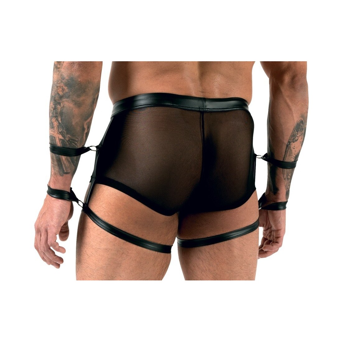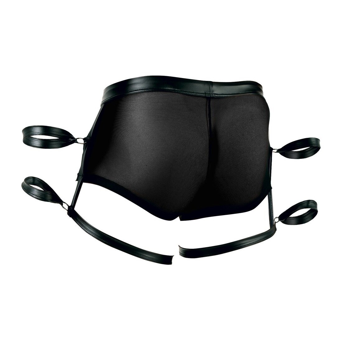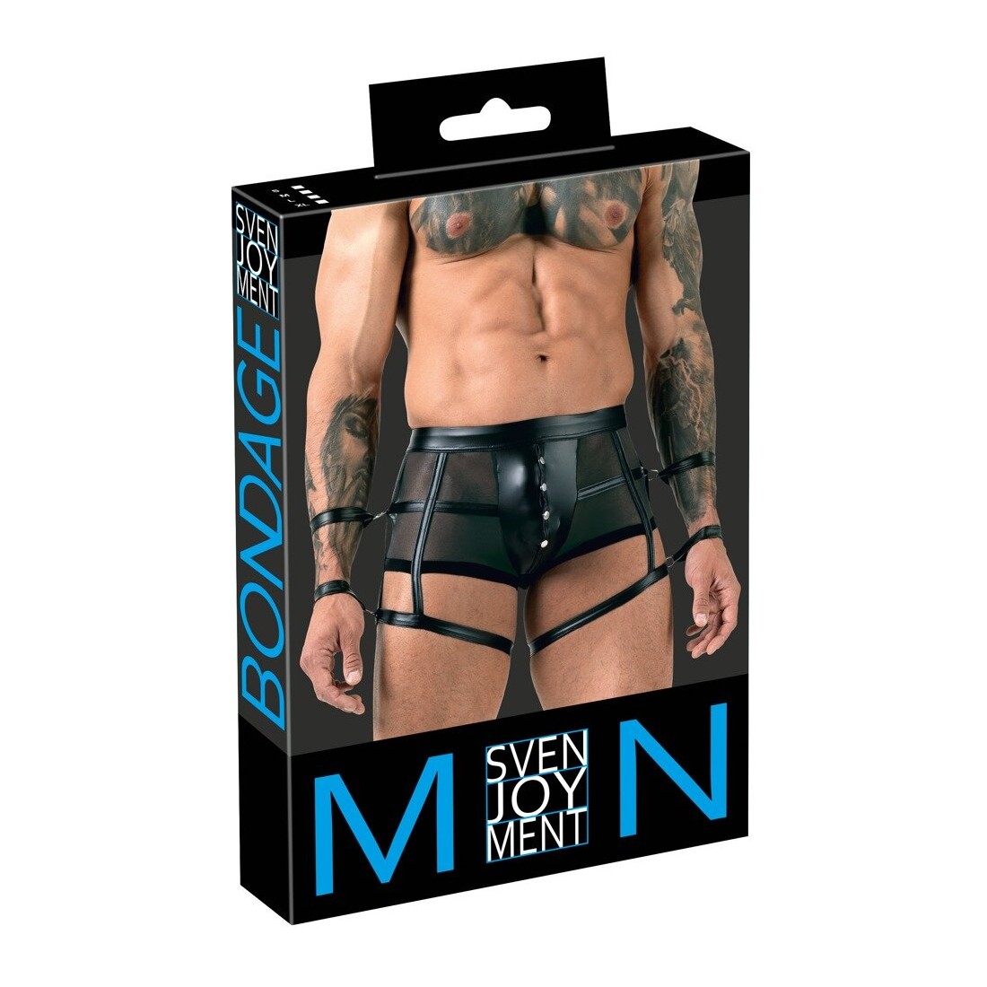 Pantaloni neri di Svenjoyment Bondage in powernet trasparente in combinazione con un nobile look opaco. Elastico e coccoloso per un alto comfort di vestibilità. Astuccio con pratici bottoni a pressione erotici da aprire. Due anelli su ogni lato con cinturini per mani/braccia - uno sui pantaloni, uno sulla coscia. Cinghie alla caviglia rimovibili con chiusura in velcro regolabile.