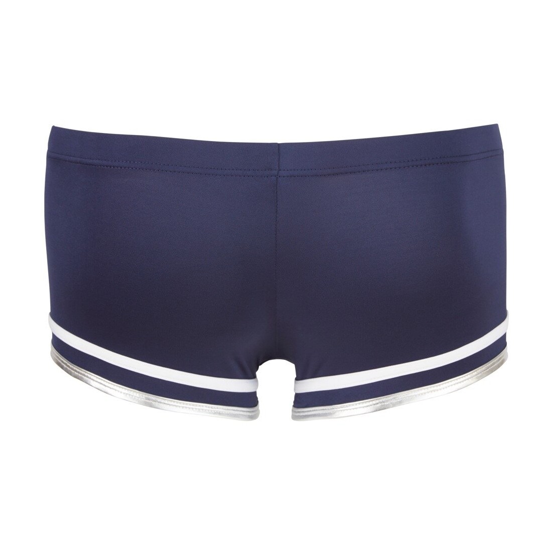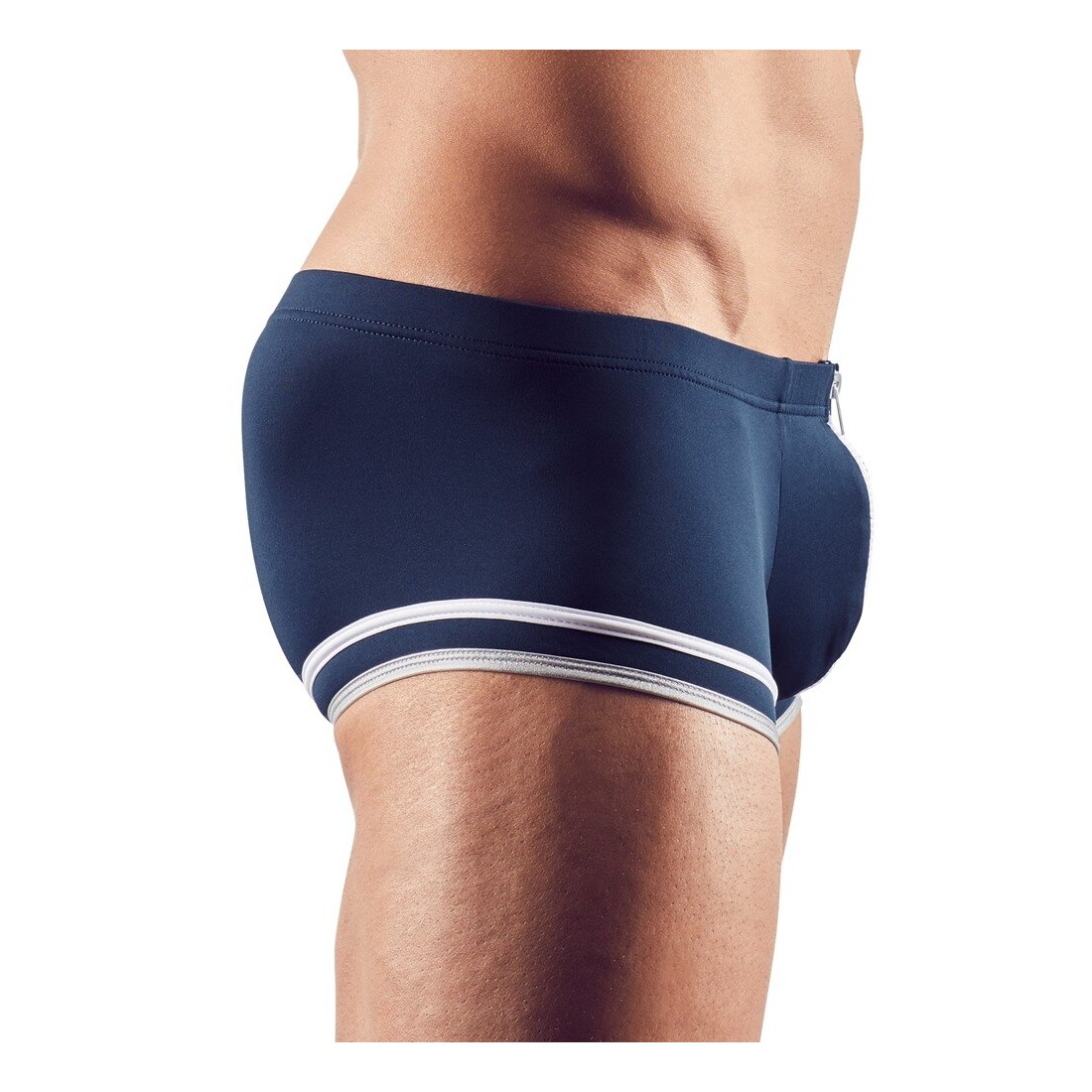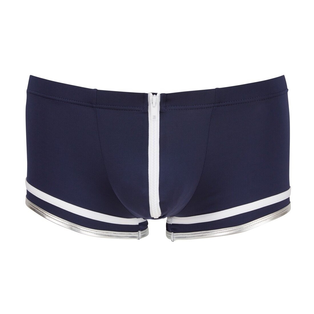 Pantaloni in morbida microfibra in look marinaresco di tendenza. Parte anteriore con cerniera extra larga e strisce decorative sul fondo della gamba.