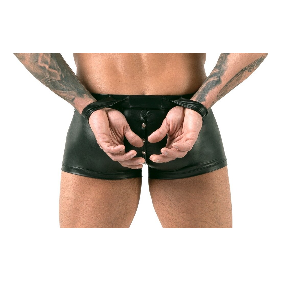 Pantaloni neri di Svenjoyment Bondage in un nobile look opaco. Elastico e coccoloso per un alto comfort di vestibilità. Con chiusura a bottoni a pressione dal davanti, attraverso il cavallo e sopra il fondo. Sul retro, le due cavigliere chiuse possono essere attaccate alla cintura per fissare le mani sulla schiena. I cinturini alla caviglia in look opaco hanno ciascuno una chiusura in velcro regolabile.