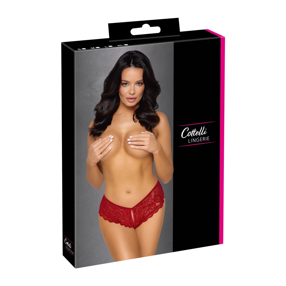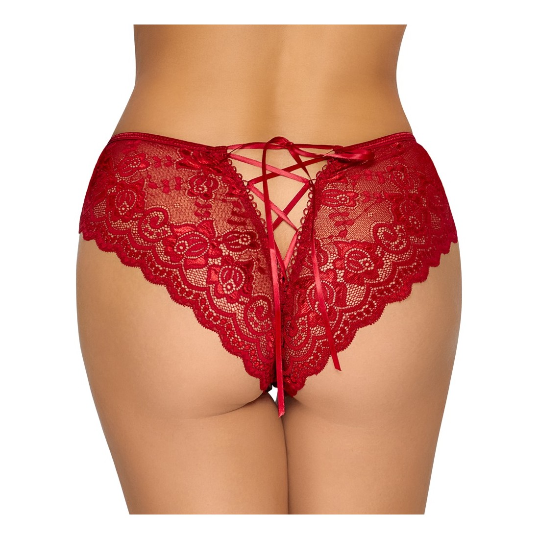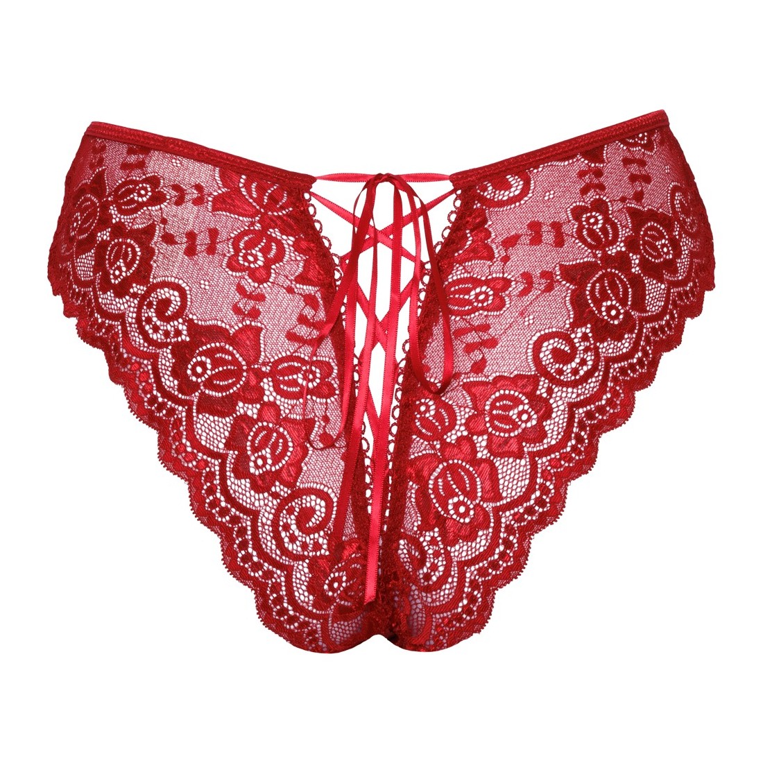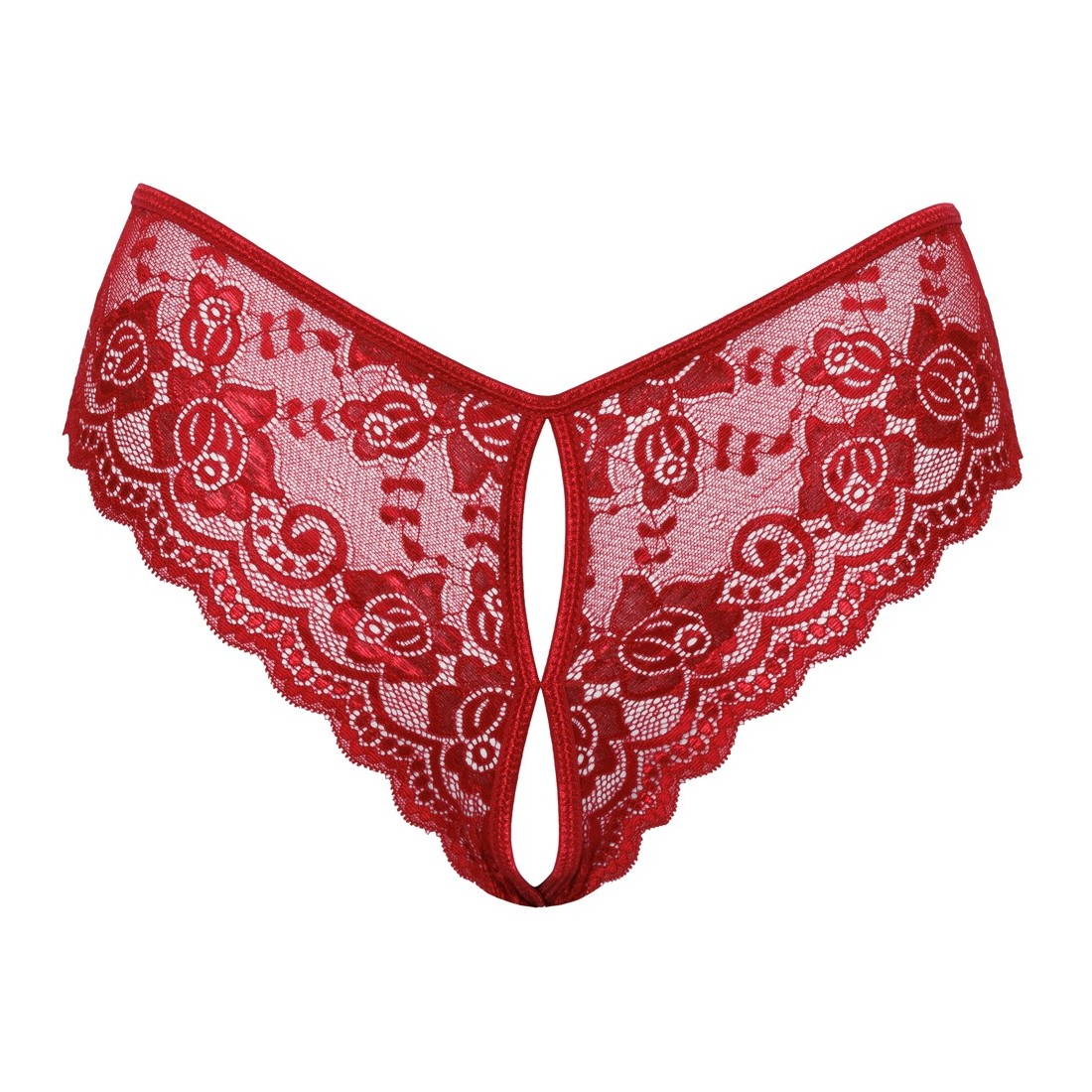 Mutandine senza cavallo riccamente realizzate di Cottelli LINGERIE realizzate in pizzo floreale rosso. Morbido ed elastico per un elevato comfort. Con apertura frontale e cavallo invitante. Con allacciatura variabile in nastro di raso sopra i glutei.