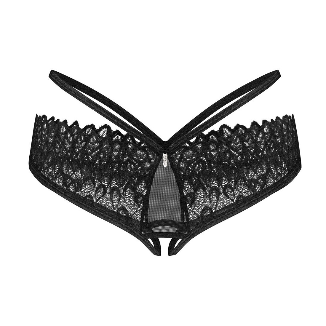 Seducente slip ouvert Donarella di Obsessive in trasparenza nera con ricami intricati. Elegante fascia elastica in vita con un piccolo elemento decorativo sul davanti. Morbido ed elasticizzato su tutta la superficie per un comfort totale. Seducente apertura sul cavallo.