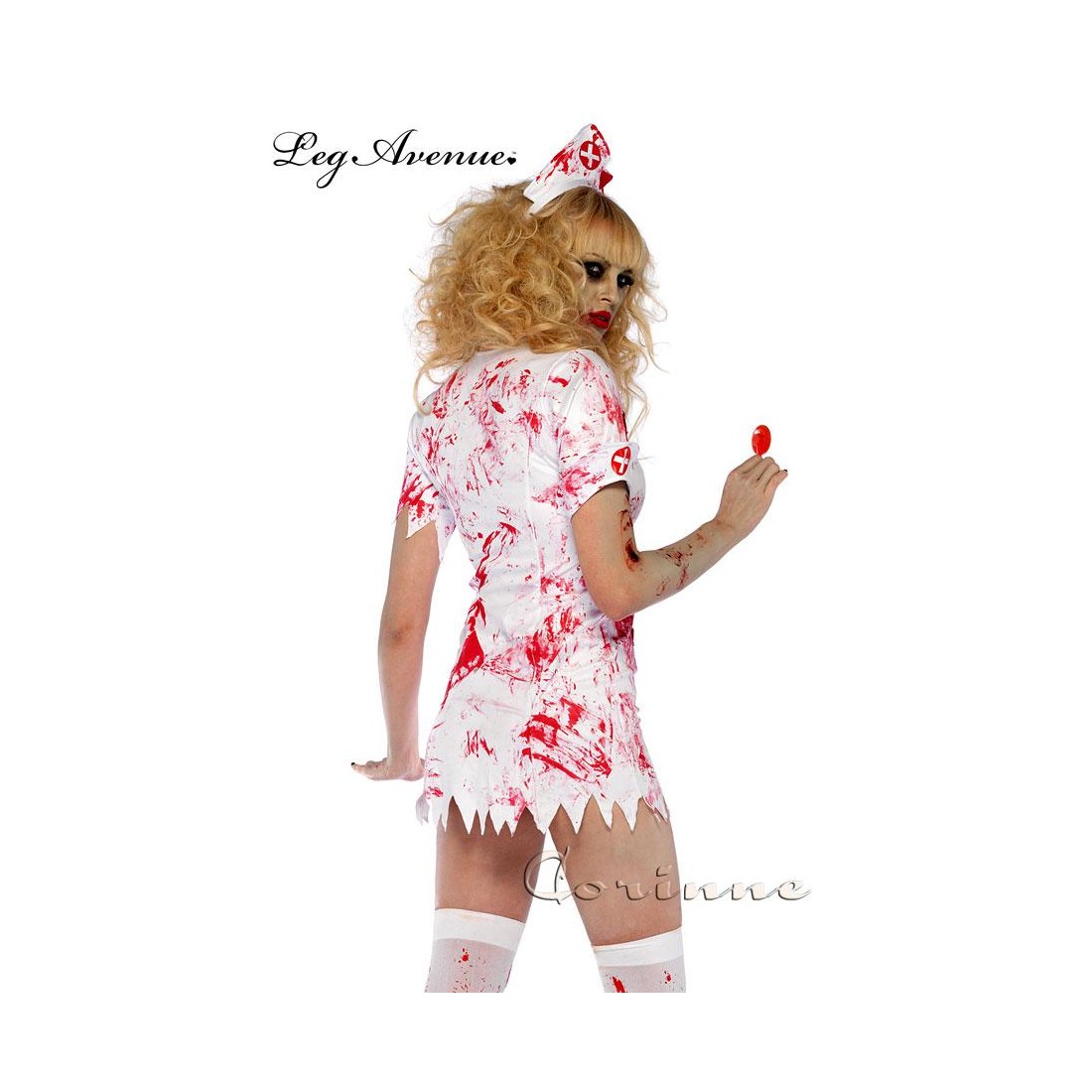 Costume 3 pezzi infermiera zombie. Comprende vestito con inserti irregolari in microrete effetto tagli, chiusura anteriore tramite zip e toppe con croce cucite su colletto e manica. Include bavaglio e cerchietto coordinato. Calze e stetoscopio esclusi.