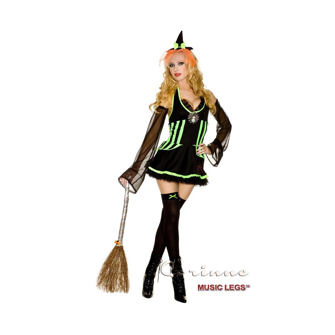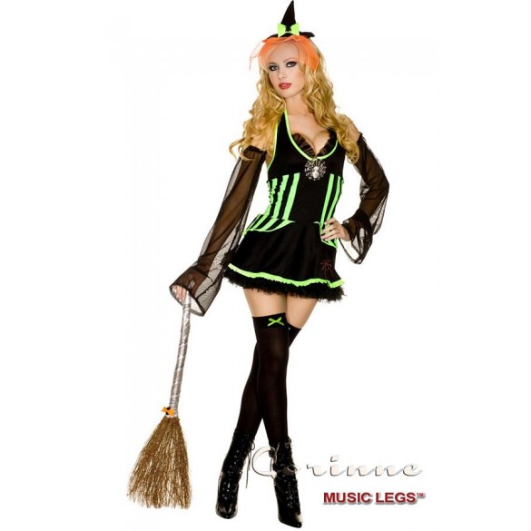 Costume da strega nero con righe verdi, arricchito da merletti arricciati in chiffon lungo il bordo del decolleté, motivo ragnatela-ragno interamente realizzato con piccole paillettes argentate e gonna con balze rifinita da un bordo inferiore plissettato e da una toppa a forma di ragno. Comprende bracciali trasparenti in tulle, cappellino con cerchietto di fissaggio e velo arancione, calze abbinate con fiocchetto. Sottogonna e scopa non inclusi.