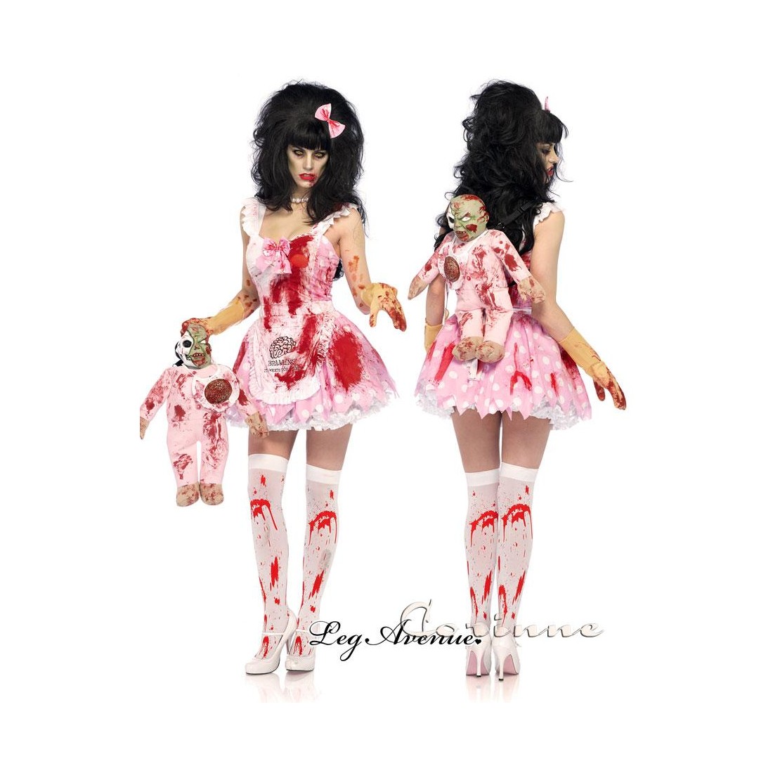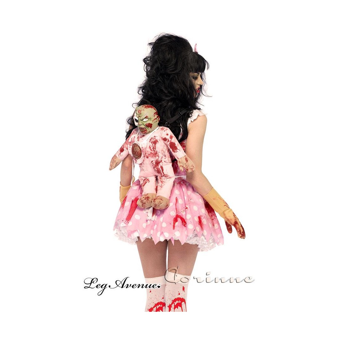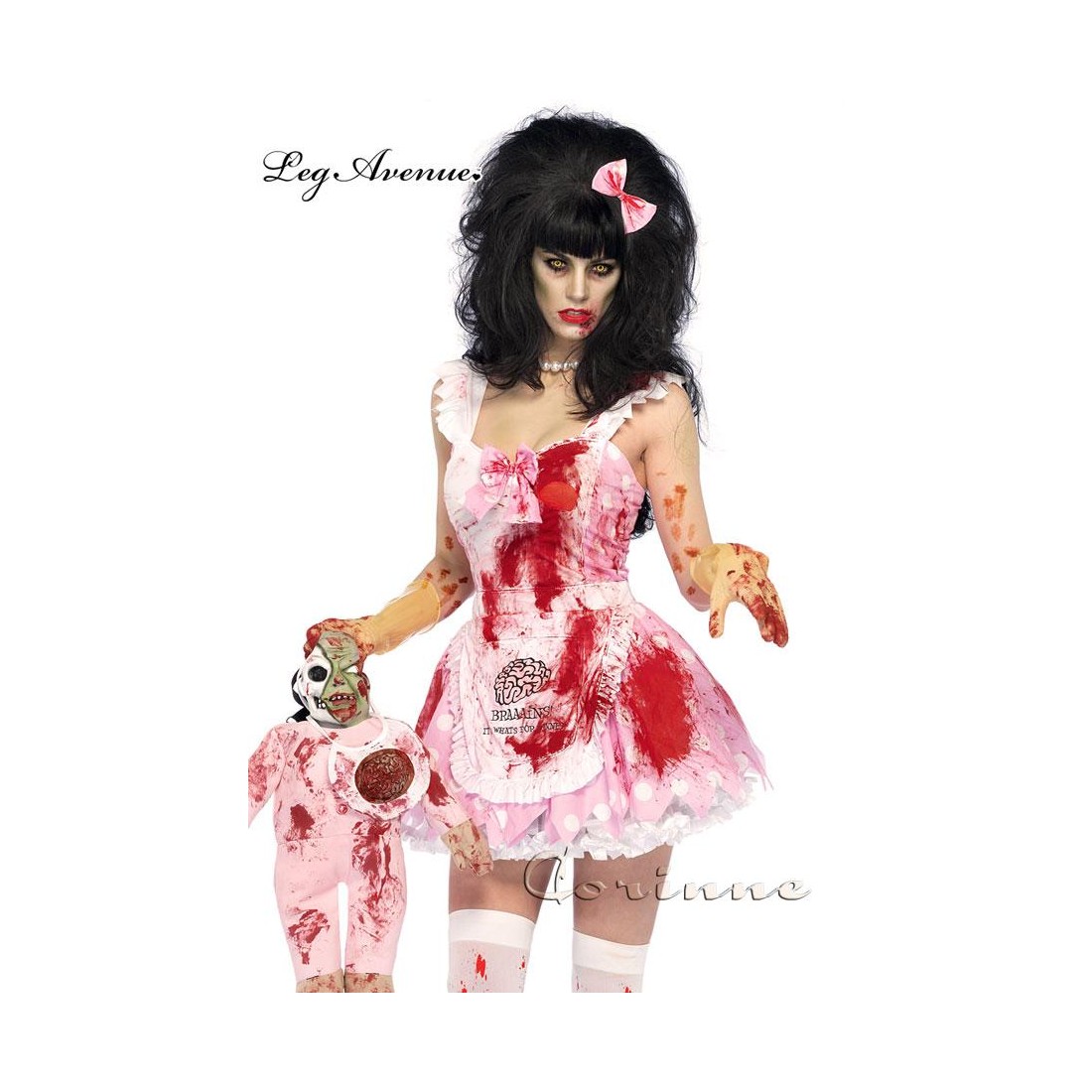 Costume 3 pezzi da casalinga zombie. Comprende vestito a pois con macchie rosse e fiocco tra le coppe; grembiulino raffigurante un cervello. Lacci cuciti ai lati da annodare dietro la schiena, bordo inferiore tagliato a zig zag e chiusura posteriore tramite zip. A corredo il fiocco per capelli e i guanti gialli.