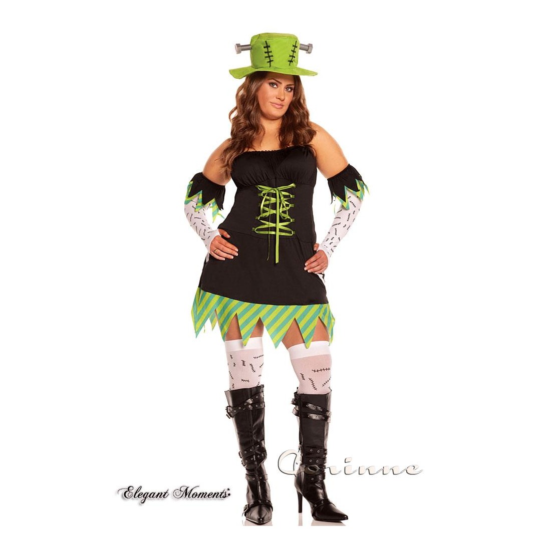 Travestimento Monster Mistress 5 pezzi. Comprende miniabito nero elasticizzato, regolabile mediante stringatura verde anteriore con bordo inferiore frastagliato a righe e braccioli in coordinato. Calze e guanti infradito bianchi con cicatrici disegnate e cappello verde con bulloni applicati lateralmente.