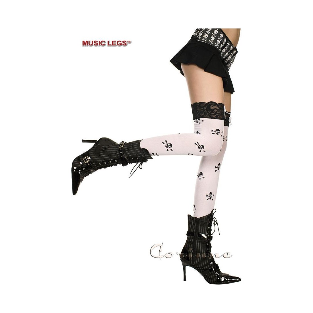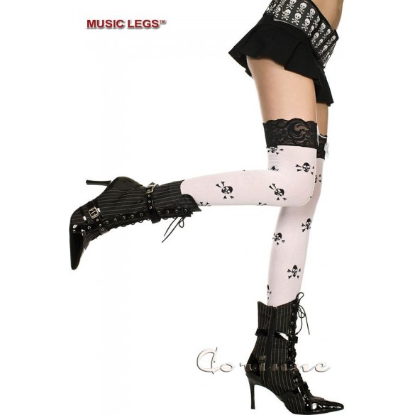 Calze da reggicalze bianche coprenti raffigurante teschi con ossa incrociate e balza in pizzo nero.