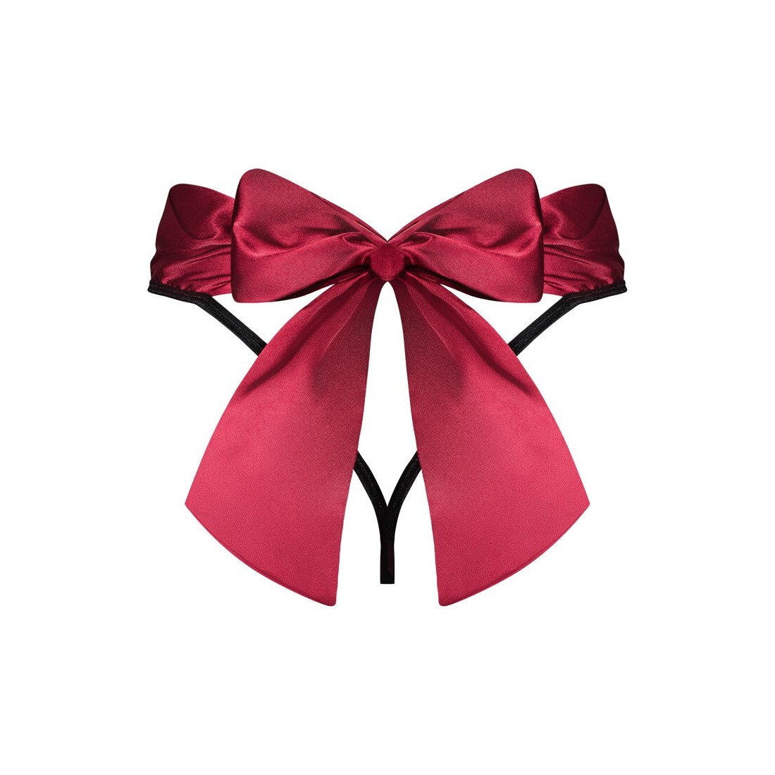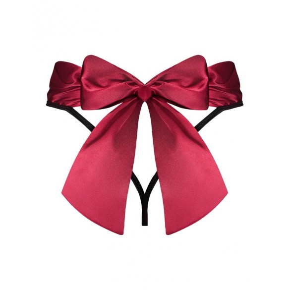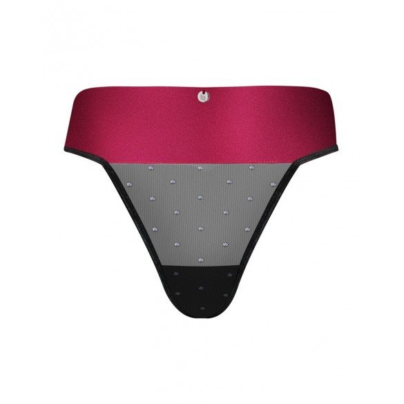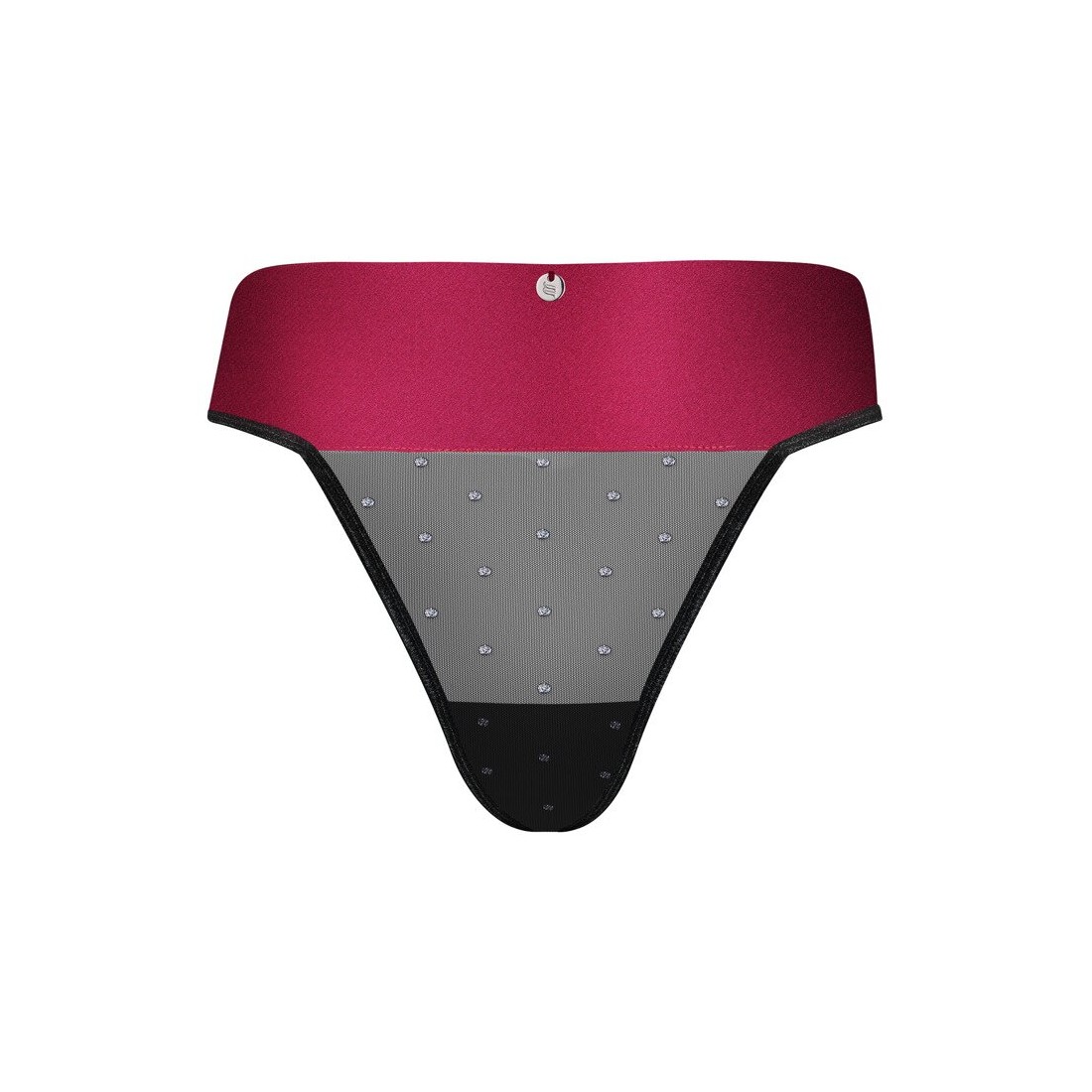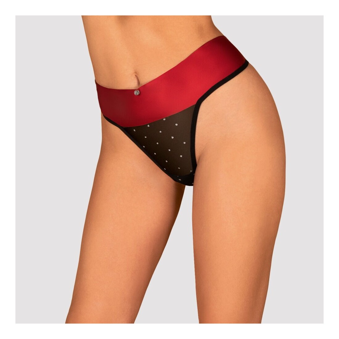 Perizoma a vita alta di Obsessive in sottile e morbido tulle trasparente con pois scintillanti. Ampia fascia in vita in raso rosso con un grande fiocco da annodare sul sedere. Piccolo elemento gioiello sul davanti della cintura.