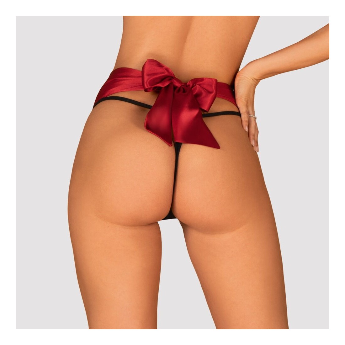 Perizoma a vita alta di Obsessive in sottile e morbido tulle trasparente con pois scintillanti. Ampia fascia in vita in raso rosso con un grande fiocco da annodare sul sedere. Piccolo elemento gioiello sul davanti della cintura.