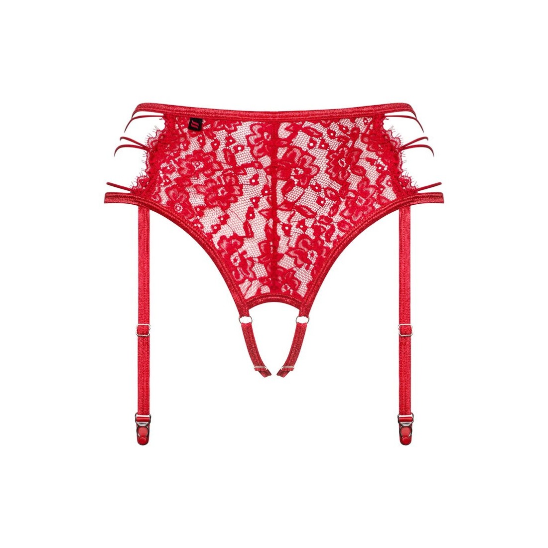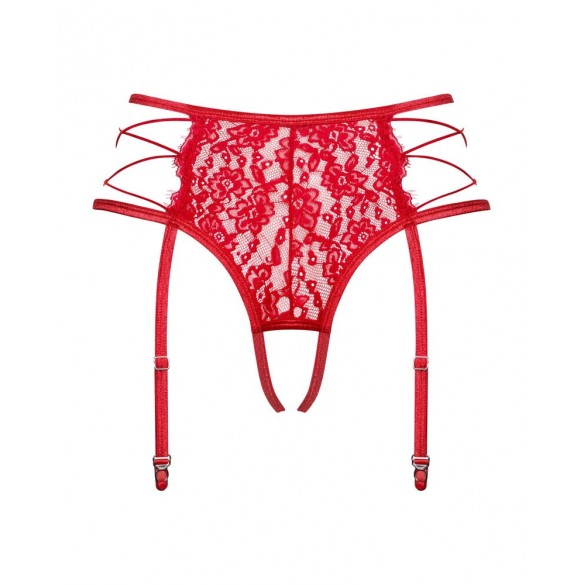 Perizoma reggicalze rosso Rediosa di Obsessive in morbido pizzo elasticizzato. Lati aperti con cinghie elastiche in un look decorativo con lacci. Le bretelle regolabili sono saldamente cucite sul perizoma. I laccetti possono essere regolati anche sul cavallo aperto per una vestibilità perfetta.