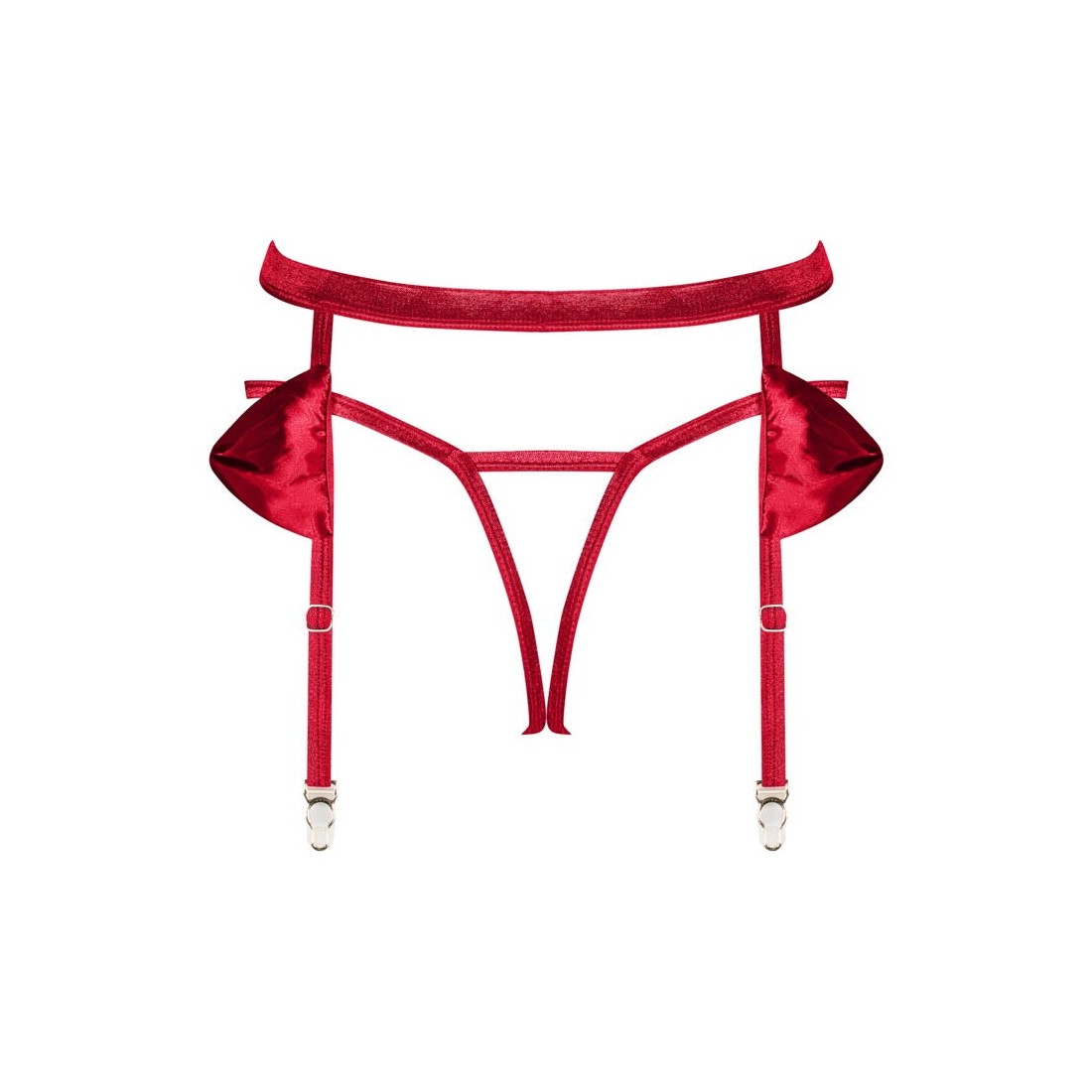 Reggicalze e perizoma inguinale nel set rosso Rubinesa di Obsessive. Morbide spalline elastiche e grandi fiocchi di raso ai lati. Reggicalze con chiusura sul retro, le bretelle sono regolabili. Perizoma senza spalline con dettaglio gioiello sul davanti della cintura.