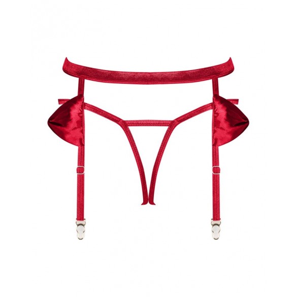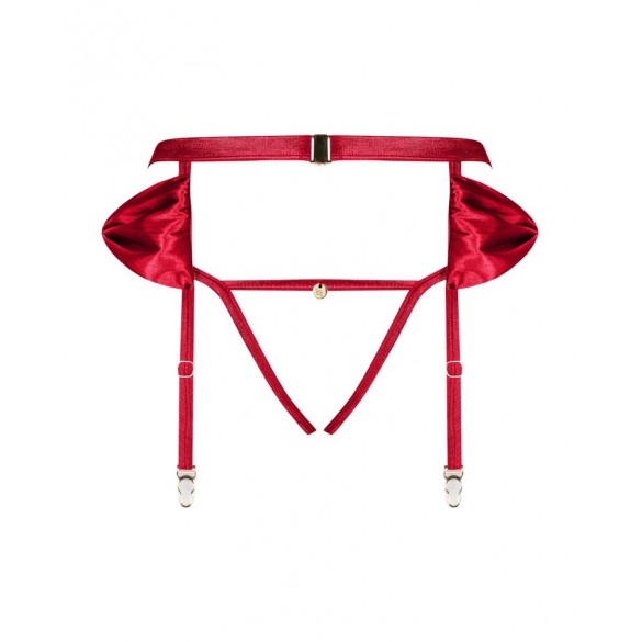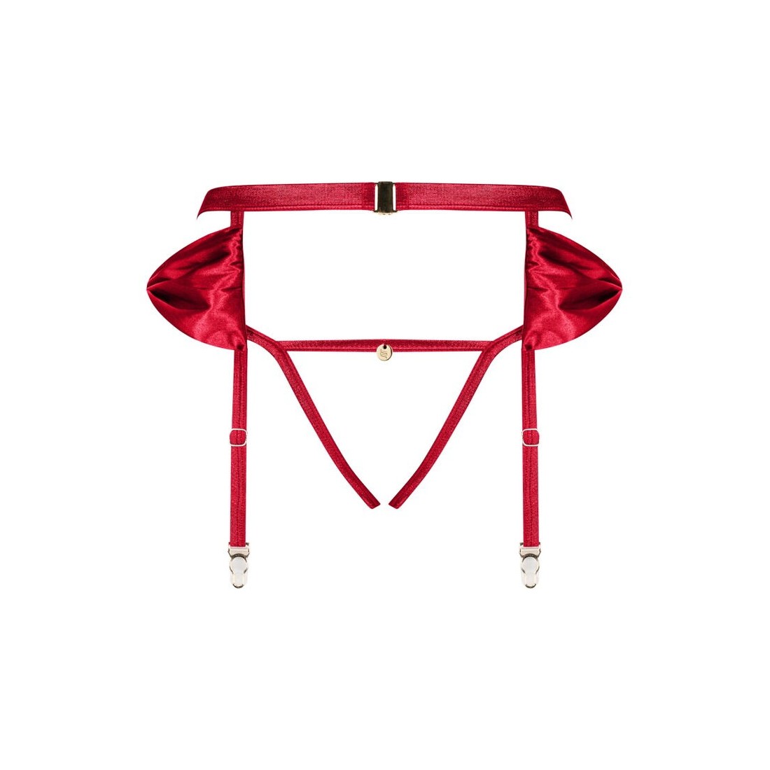Reggicalze e perizoma inguinale nel set rosso Rubinesa di Obsessive. Morbide spalline elastiche e grandi fiocchi di raso ai lati. Reggicalze con chiusura sul retro, le bretelle sono regolabili. Perizoma senza spalline con dettaglio gioiello sul davanti della cintura.