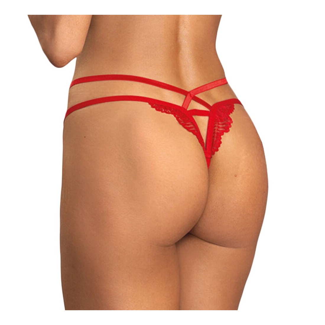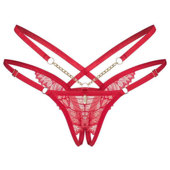 Perizoma Matildea crotchless di Obsessive in un elegante stile strappy. In rosso intenso con pizzo e dettagli dorati. Morbido ed elasticizzato per un elevato comfort. 2 catene e un piccolo elemento di gioielleria ornano la parte anteriore. La cintura inferiore può essere regolata per adattarsi. Seducente apertura sul cavallo.