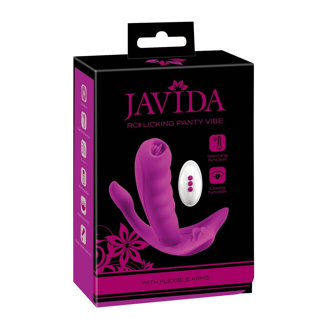 RC Licking Panty Vibe impermeabile di Javida con vibro lingue, stimolatore clitorideo e anale - più una funzione di calore fino a 42°C. Indossato nelle mutandine, Panty Vibe, dalla forma anatomicamente perfetta, coccola tutta la tua zona intima - in modo del tutto silenzioso e discreto: l'asta a coste massaggia la vagina, la vibro-lingua in punta punta punta direttamente il punto G, il sottile stimolatore flessibile coccola l'ano e lo stimolatore clitorideo pizzica con le sue piccole lingue proprio sul punto caldo.