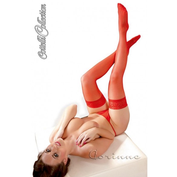 Calze rosse autoreggenti in puro raso di alta qualità. Balza in pizzo con strip di silicone. Piede preformato e antiscivolo. Tessuto certificato Oeko-Tex.