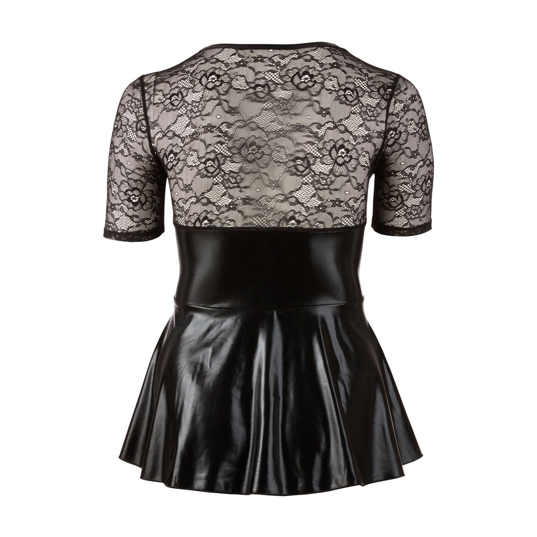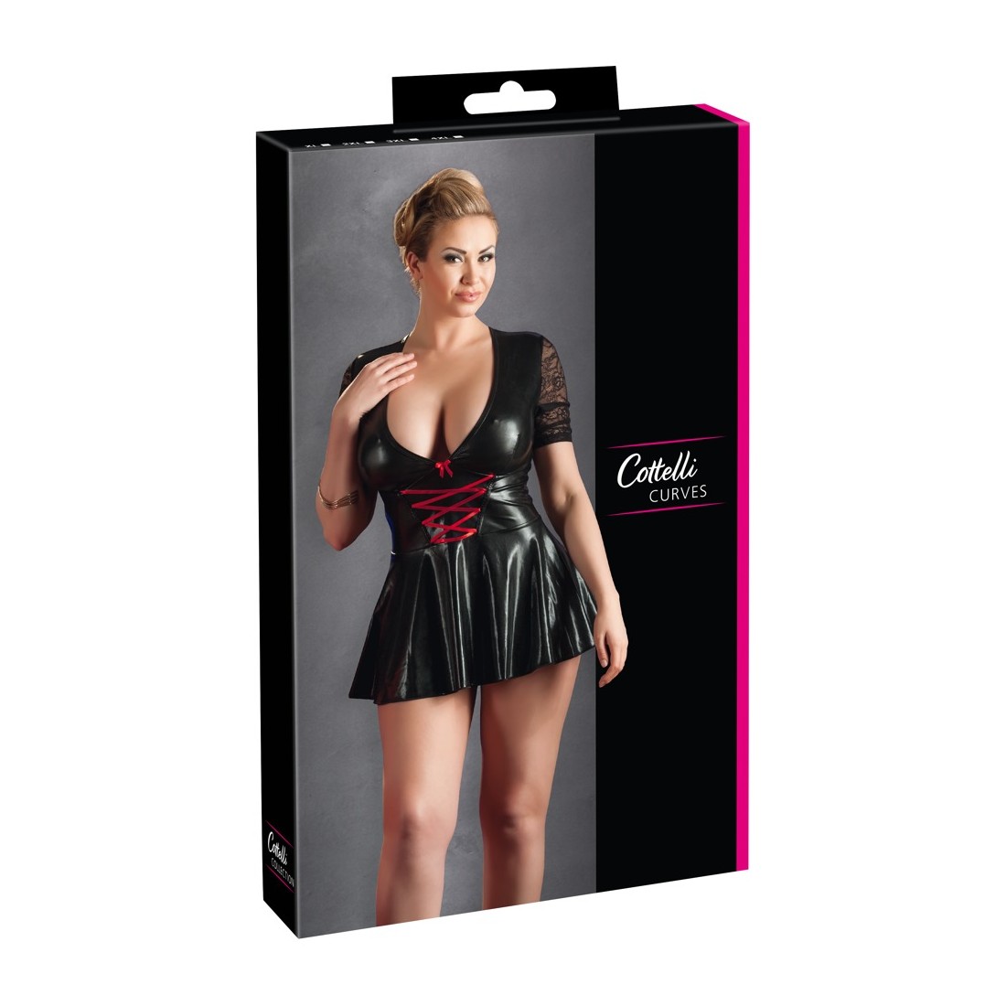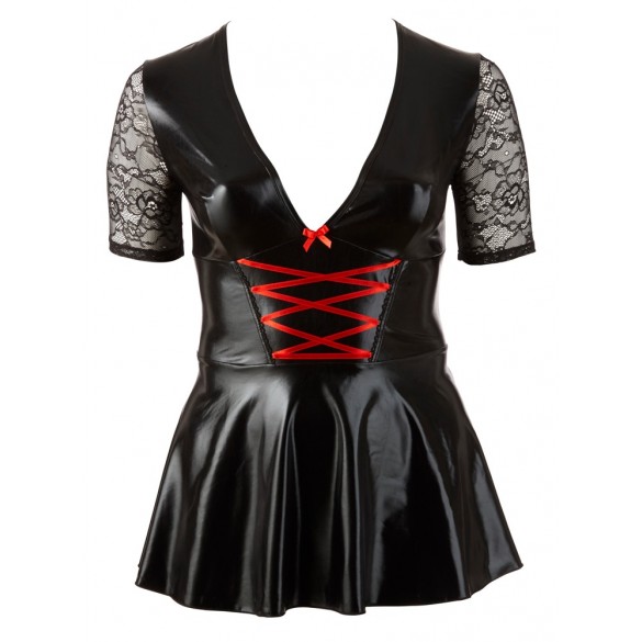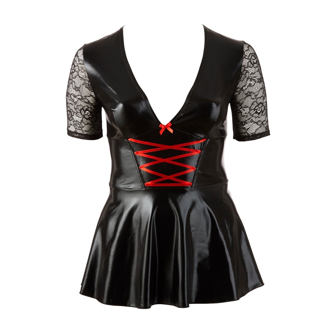Mini abito con allacciatura rossa alla profonda scollatura, maniche corte in pizzo e parte della gonna svasata. Retro con inserto in pizzo.
