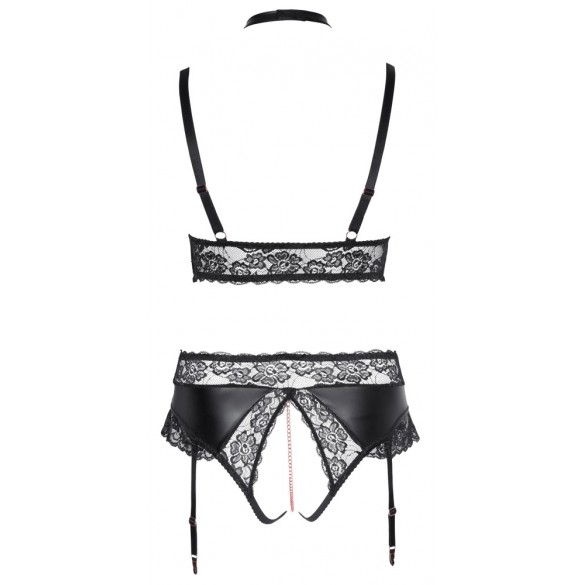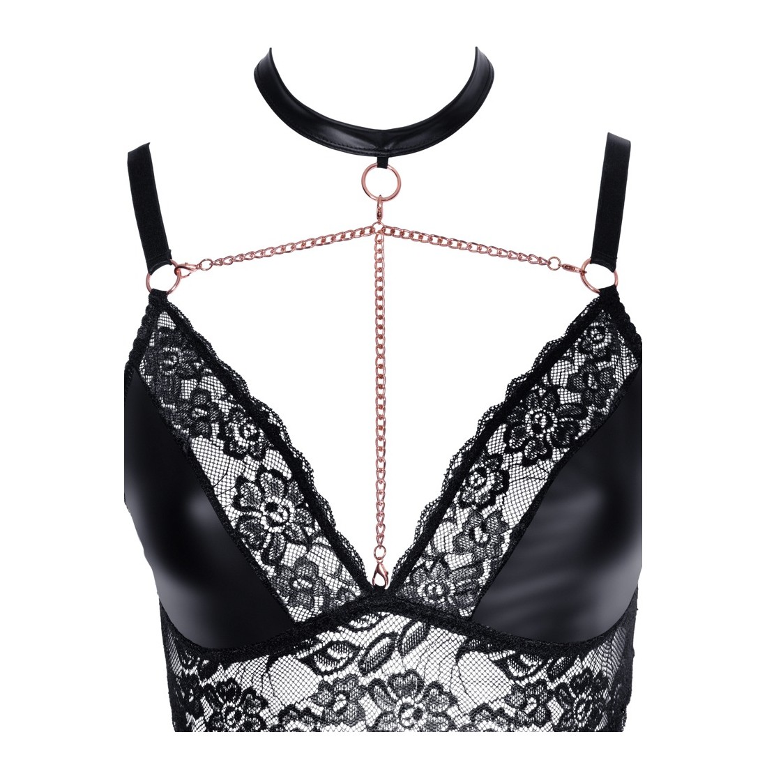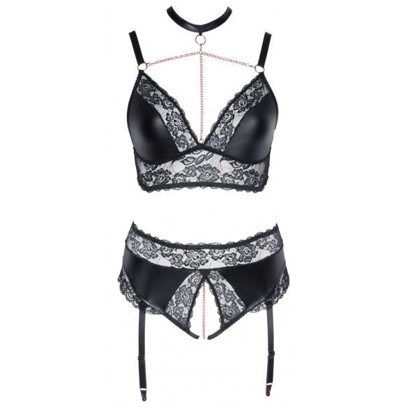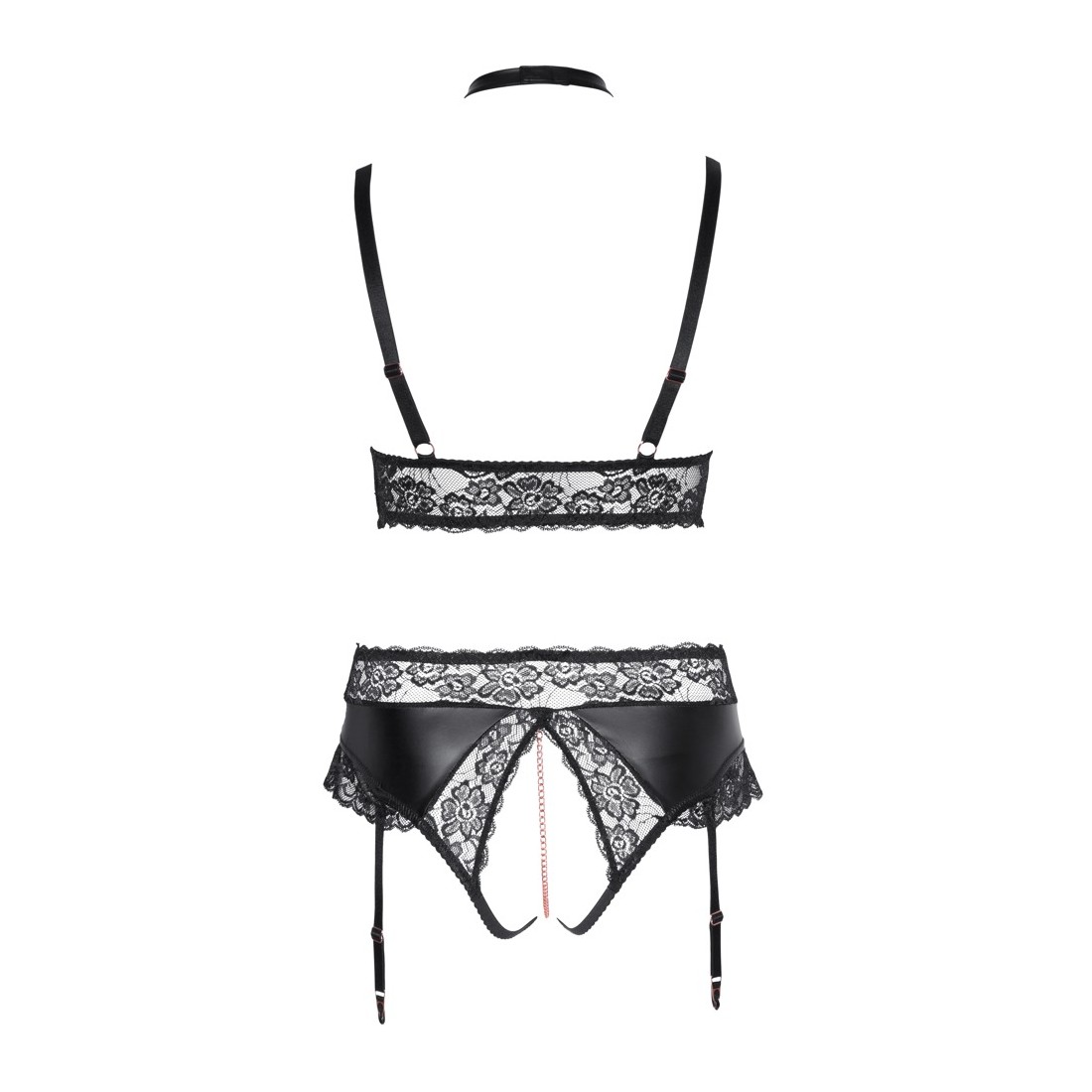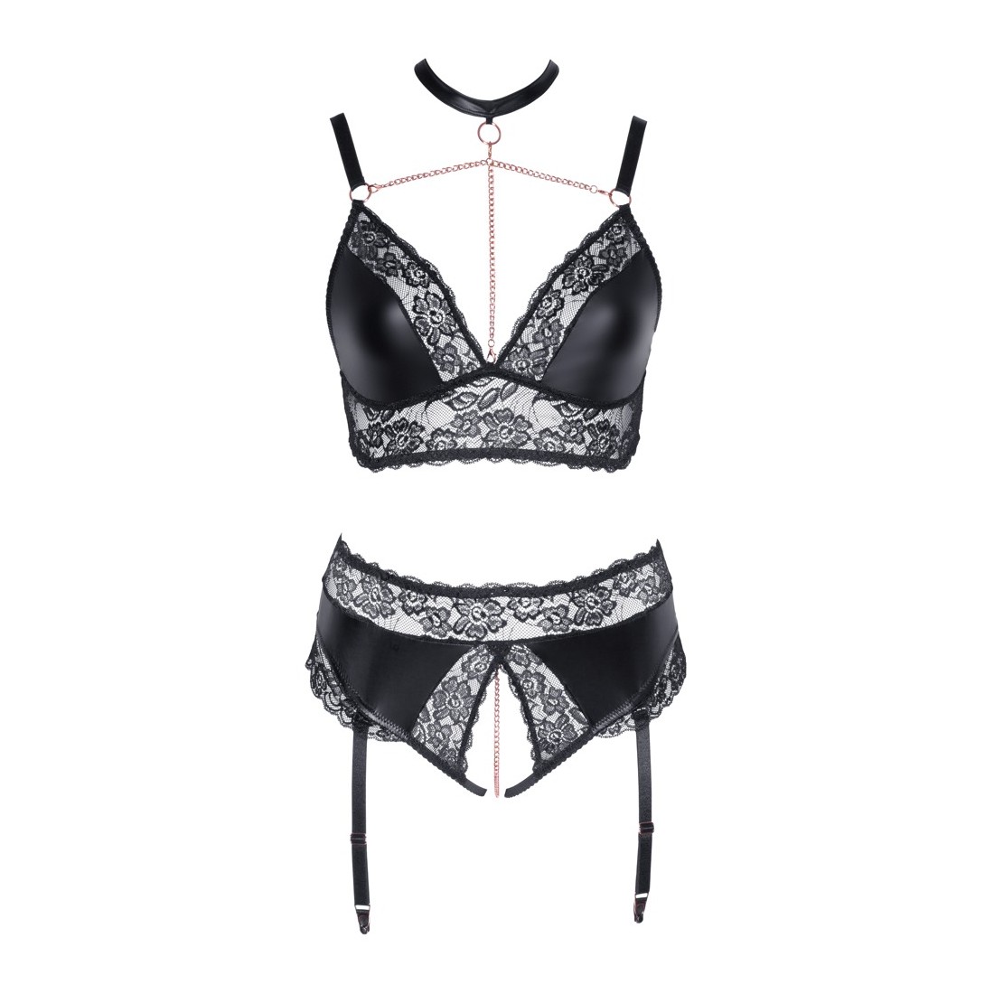 Morbido reggiseno e slip ouvert di Cottelli CURVES in un mix di look opaco con morbido pizzo elastico ed elementi color oro rosa. Il reggiseno segna con le sue catene da scollatura, che sono staccabili dal collare (con chiusura in velcro) e dal reggiseno. Gli slip sono aperti in modo invitante sul cavallo fino a sopra il fondo e hanno una stimolante catena sul cavallo. Le bretelle regolabili sono rimovibili dallo slip.