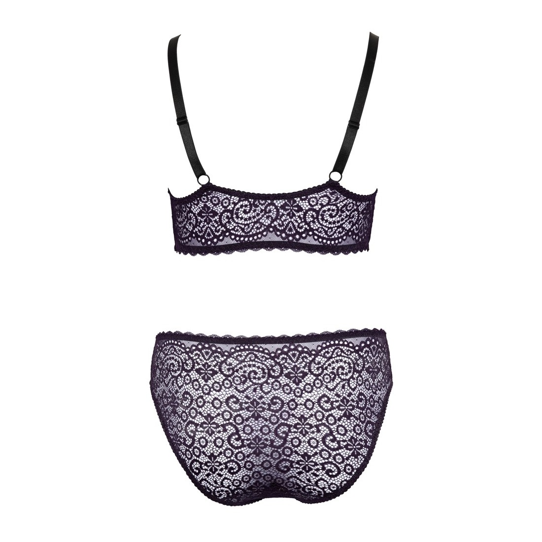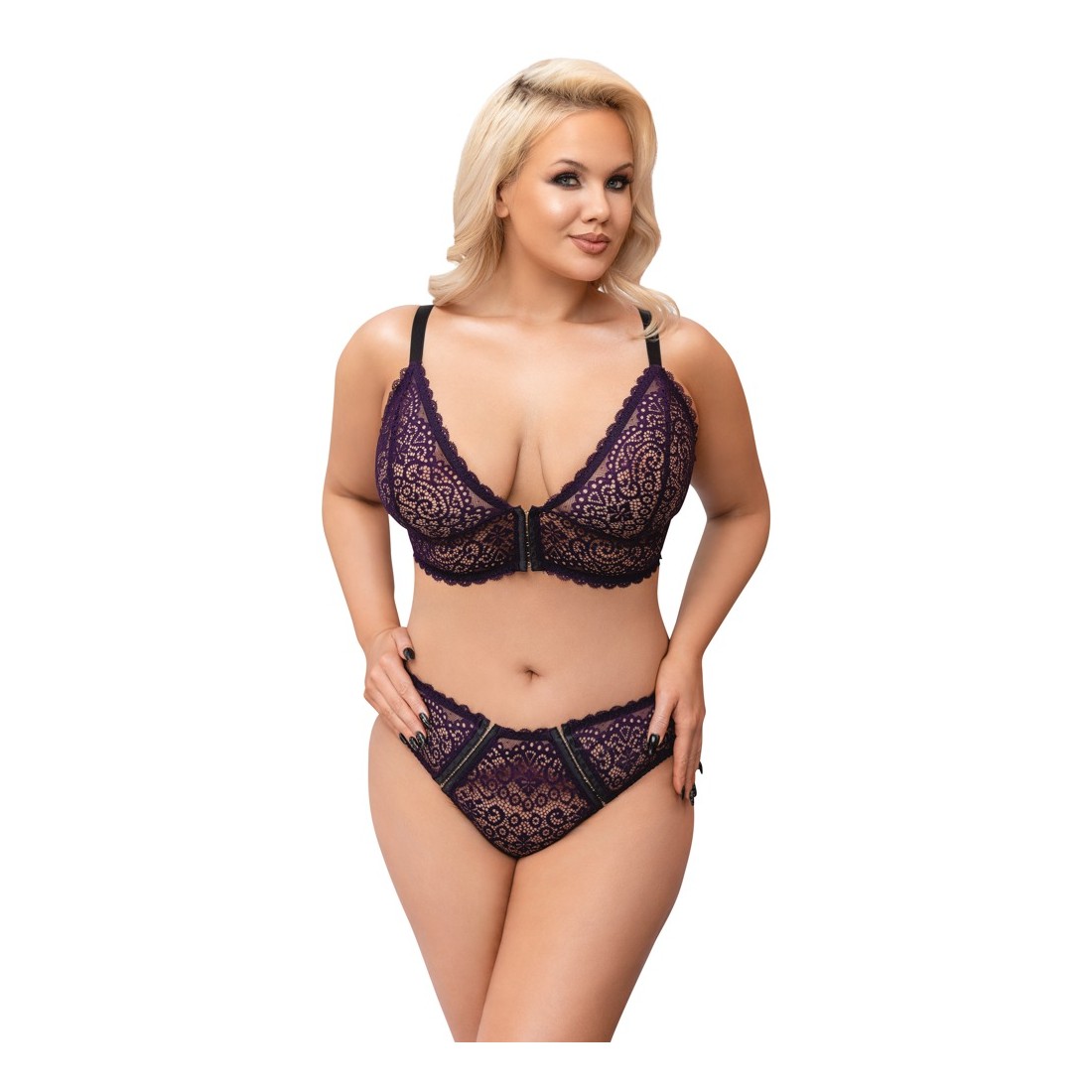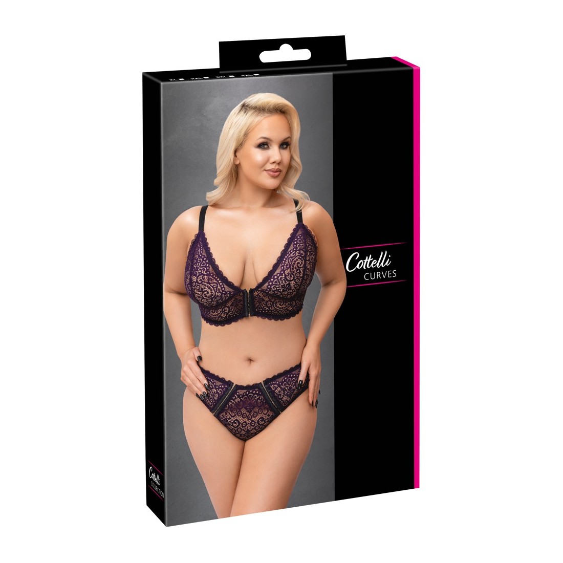 Set bralette e slip di Cottelli CURVES completamente realizzato in pregiato pizzo viola. Morbido ed elastico su tutto il perimetro per il massimo comfort. Bralette con chiusura a gancio a tutta lunghezza tra le coppe. Le cinghie sono regolabili. Gli slip sono dotati di 2 strisce di chiusura a gancio sul davanti che possono anche essere aperte completamente.