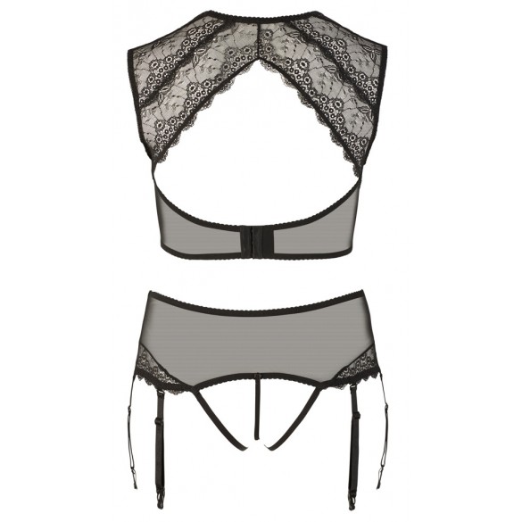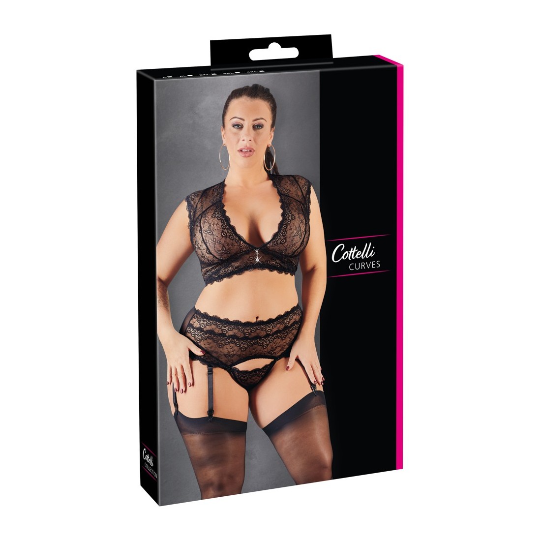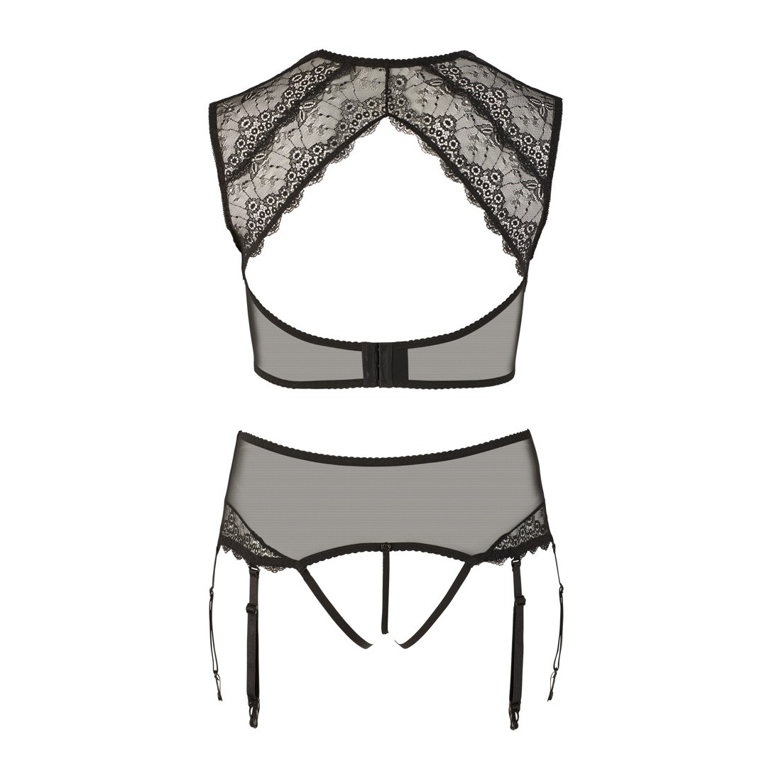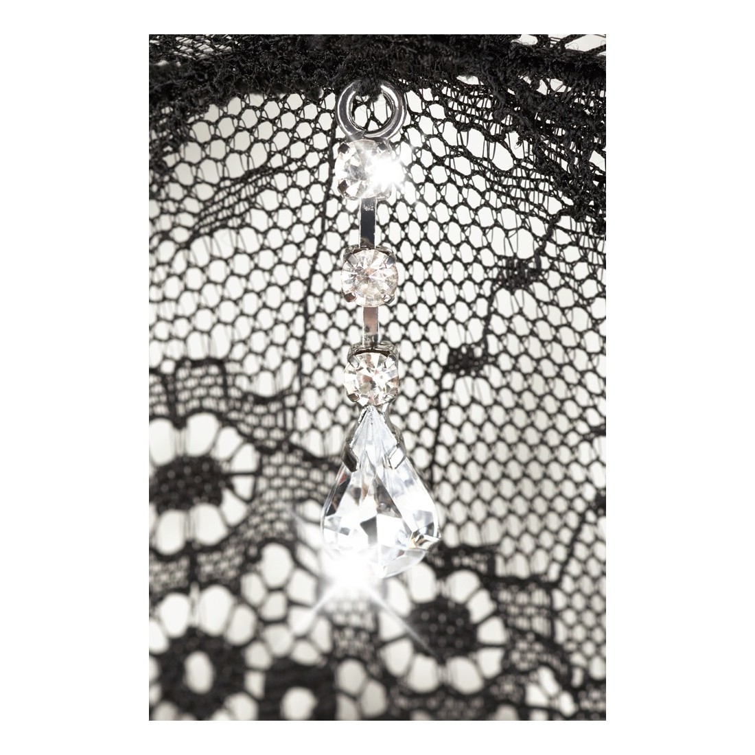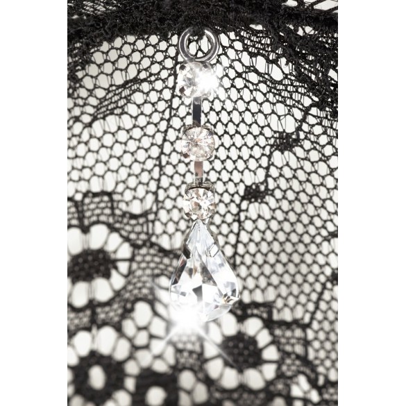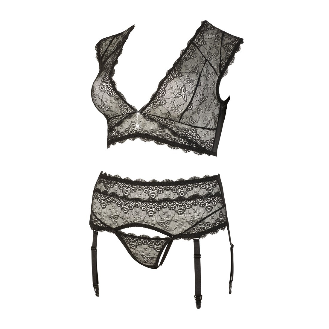 Bralette e reggicalze in morbido pizzo elastico misto a powernet. Bralette con elemento di strass nella scollatura extra profonda e chiusura a gancio nella parte posteriore. Perizoma con 6 bretelle regolabili e rimovibili e parte del perizoma staccabile, in modo che solo 2 elastici passino attraverso il cavallo al lato.