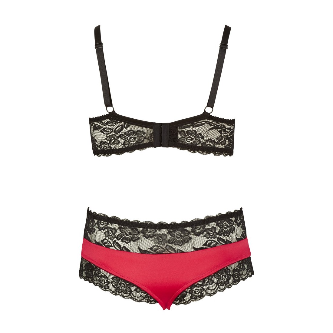 Nobile reggiseno longline con larghe spalline regolabili, coppe in raso elastico rosso e pizzo nero a fiori. Un piccolo cuore di strass aggiunge un po' di risalto alla scollatura. Il perizoma abbinato con cintura extra-alta affascina con lo stesso mix di materiali e imposta con il suo taglio modellante le forme femminili perfettamente in scena.