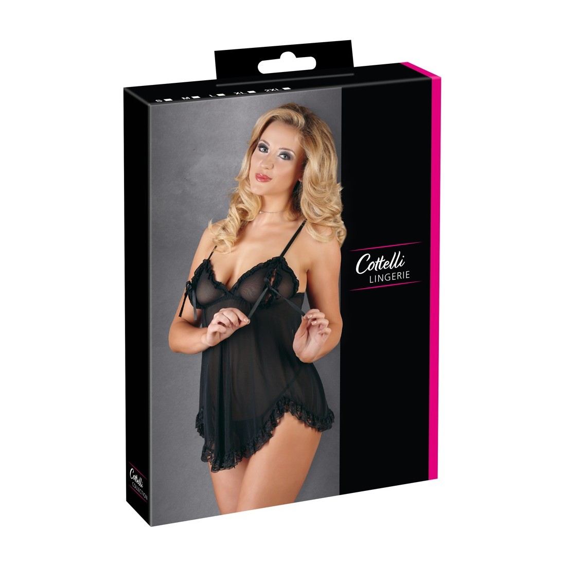 Babydoll con spalline regolabili e chiusura a gancio sulla schiena. Le coppe aperte da chiudere con un piccolo fiocco sono increspate, l'orlo è in pizzo. Perizoma incluso.