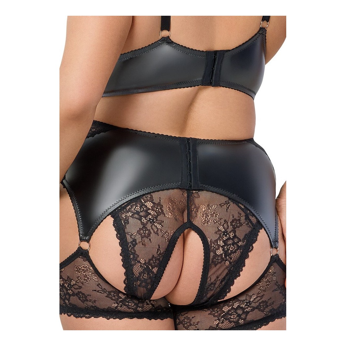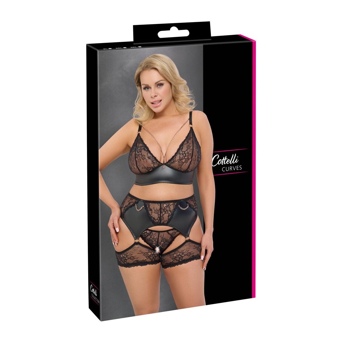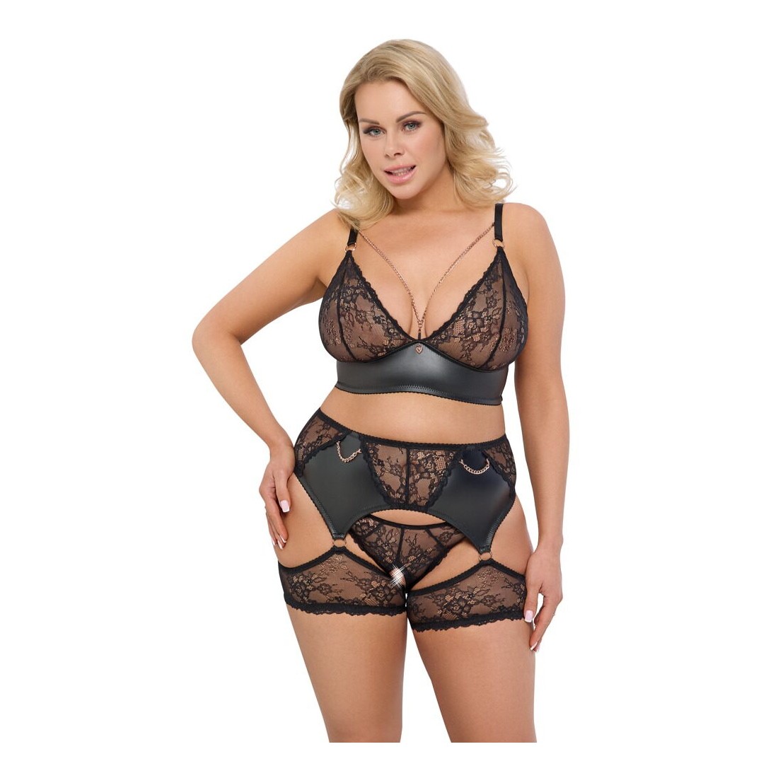 Set reggicalze nero di Cottelli CURVES con reggiseno, slip inguinali e reggicalze con giarrettiera. Realizzato in morbido pizzo elasticizzato con inserti elasticizzati per una perfetta vestibilità e un elevato comfort. Gli accessori color oro rosa completano il look elegante. Reggiseno con catene gioiello nella scollatura e ciondoli a cuore tra le coppe in morbido pizzo. Le spalline e la chiusura a gancetto sulla schiena possono essere regolate in base alle esigenze. Reggicalze con catena gioiello sul davanti. Chiusura a gancio regolabile sul retro. Le bretelle in pizzo elasticizzato sono fissate al reggicalze con anelli. Gli slip in pizzo seducono con il loro cavallo aperto.