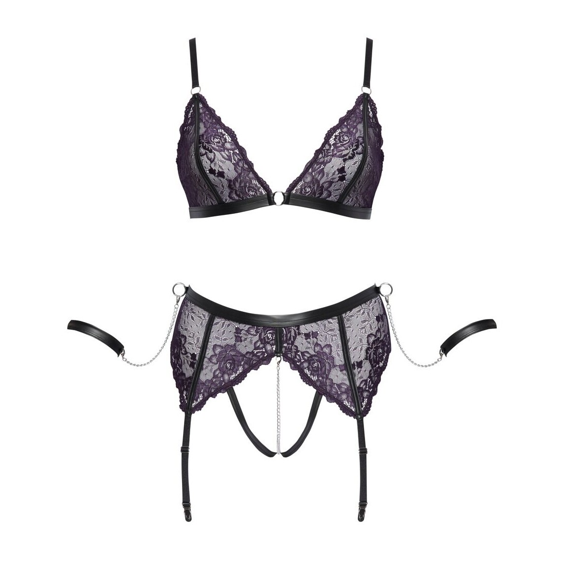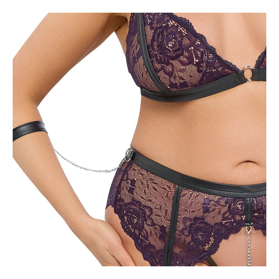 Set di reggicalze Cottelli BONDAGE con reggiseno morbido, reggicalze senza cavallo e due polsini morbidi per le braccia. Delicato pizzo viola scuro con dettagli neri opachi e anelli e catene color argento. Reggiseno con coppe morbide, spalline regolabili e chiusura a gancio regolabile sulla schiena. Come il reggicalze con bretelle regolabili. Cavallo completamente aperto con catena stimolante rimovibile. Le cavigliere con catene a moschettone possono essere agganciate agli anelli ai lati della cintura alta. Le morbide cavigliere possono essere indossate e tolte rapidamente grazie alle loro chiusure in velcro regolabili.