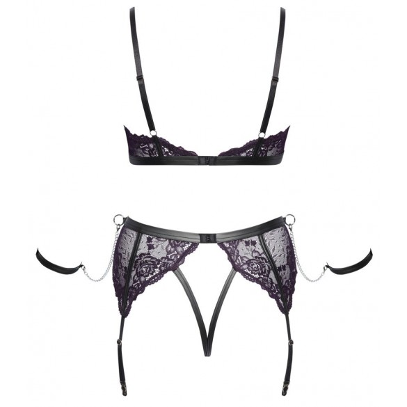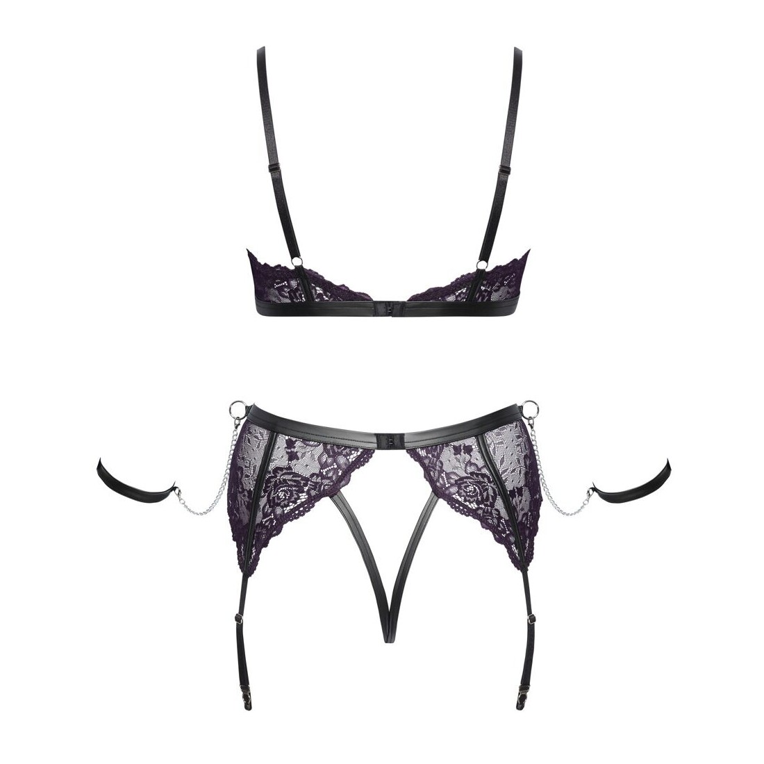 Set di reggicalze Cottelli BONDAGE con reggiseno morbido, reggicalze senza cavallo e due polsini morbidi per le braccia. Delicato pizzo viola scuro con dettagli neri opachi e anelli e catene color argento. Reggiseno con coppe morbide, spalline regolabili e chiusura a gancio regolabile sulla schiena. Come il reggicalze con bretelle regolabili. Cavallo completamente aperto con catena stimolante rimovibile. Le cavigliere con catene a moschettone possono essere agganciate agli anelli ai lati della cintura alta. Le morbide cavigliere possono essere indossate e tolte rapidamente grazie alle loro chiusure in velcro regolabili.
