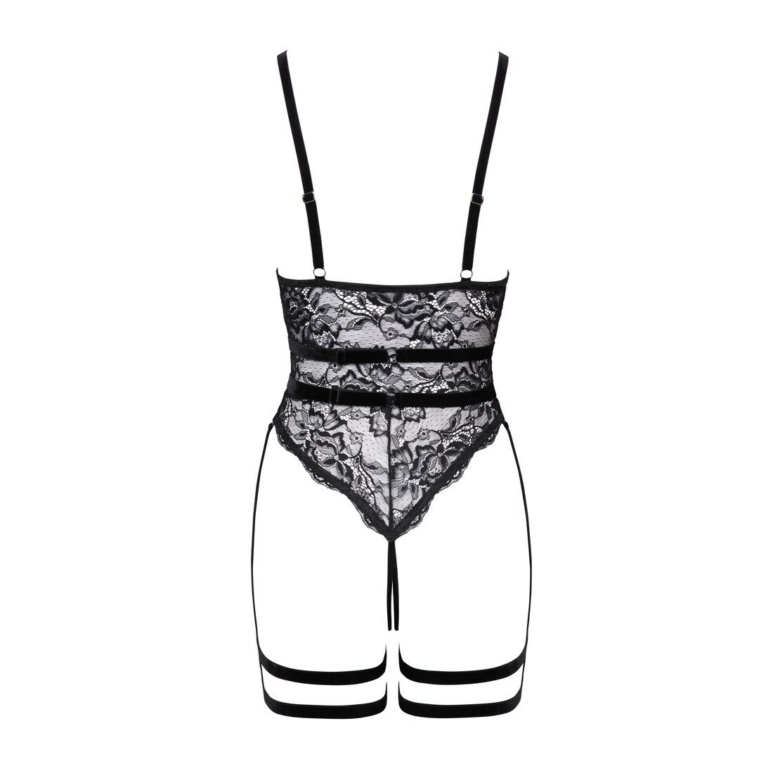 Body crotchless nero di Cottelli LINGERIE con reggicalze e bretelle (tutti rimovibili). Corpo in morbido pizzo floreale nero elasticizzato. Completamente aperto sul davanti, gli anelli decorativi color argento tengono saldamente insieme il tutto. Seducente anche l'apertura sul cavallo. Coppe in pizzo con piccole chiusure a gancio per l'apertura, spalline eleganti e anello. Spalline in velluto elasticizzato regolabili in vita. Anche le spalline e le cosce sono realizzate con cinghie di velluto elasticizzate e possono essere regolate per adattarsi. I gioielli per le cosce possono anche essere rimossi completamente insieme alle bretelle.