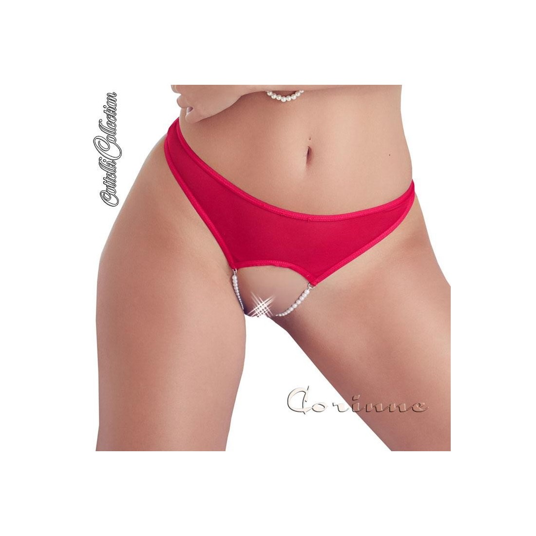 Tanga in tulle con doppio filo di perle al cavallo e posteriormente. Colore rosso.