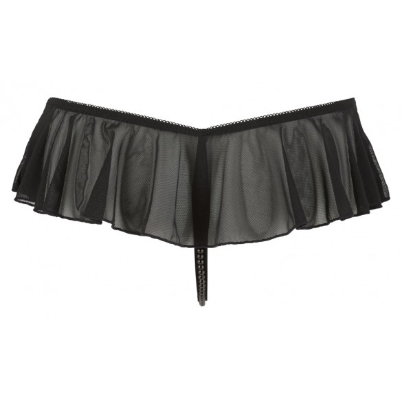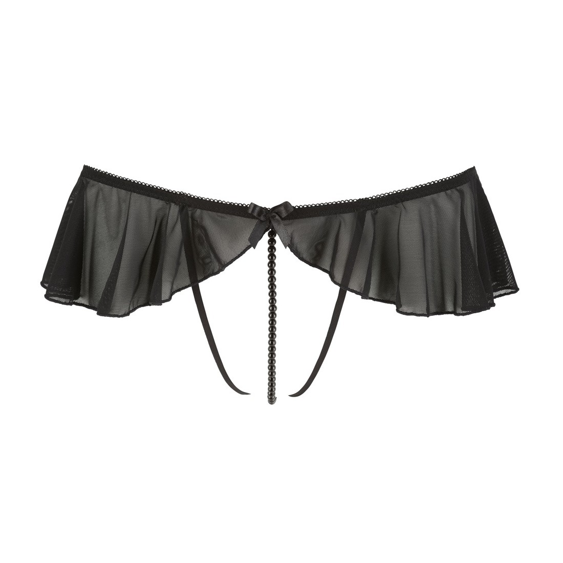 Sensuale perizoma ouvert con balze che valorizzano la figura e collana di perle nere attraverso il cavallo. Il pube aperto è lascivamente incorniciato da 2 nastri elastici.