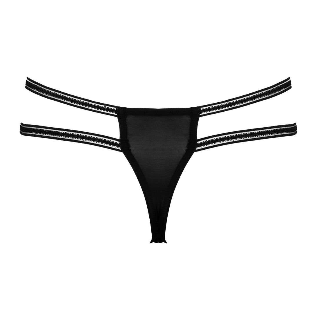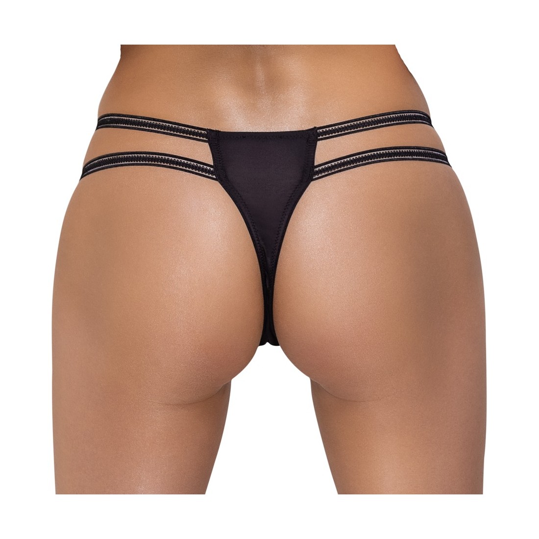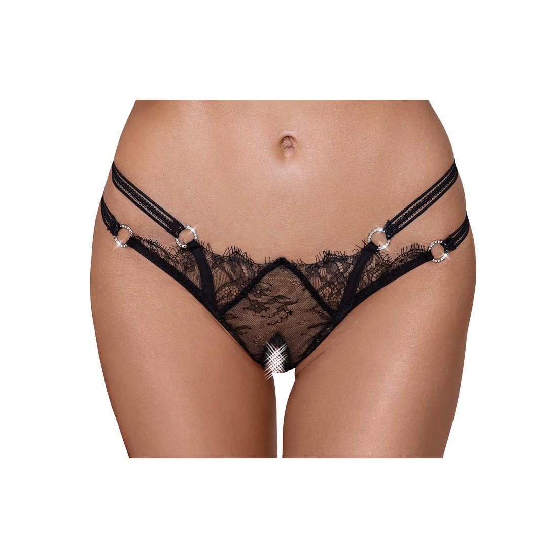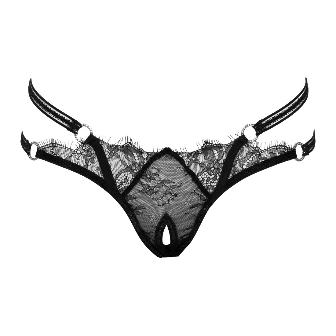 Perizoma Rio di Cottelli LINGERIE in delicato pizzo a ciglia parzialmente sovrapposte. Fascia elastica elaborata a doppia vita con 4 anelli di strass iridescenti. Inserto elasticizzato sul retro per una vestibilità perfetta e confortevole. Aperta in modo invitante sul cavallo.