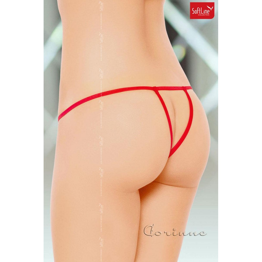 Slip elasticizzato in microrete rossa, aperto davanti e posteriormente, con fiocchetto in satin centrale e volant in pizzo sul bordo superiore.
