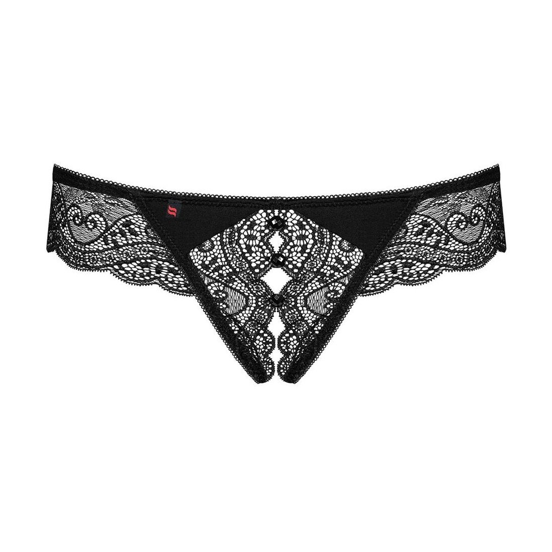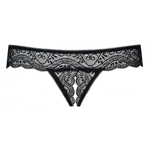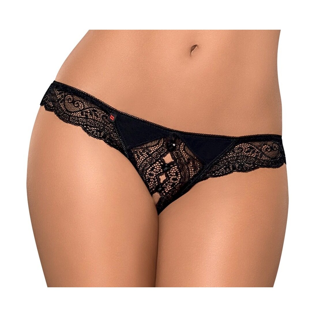 Perizoma Rio in pizzo morbido ed elasticizzato con fascia in vita in pizzo leggermente più larga. Aperto all'inguine e sul sedere, per fughe erotiche.