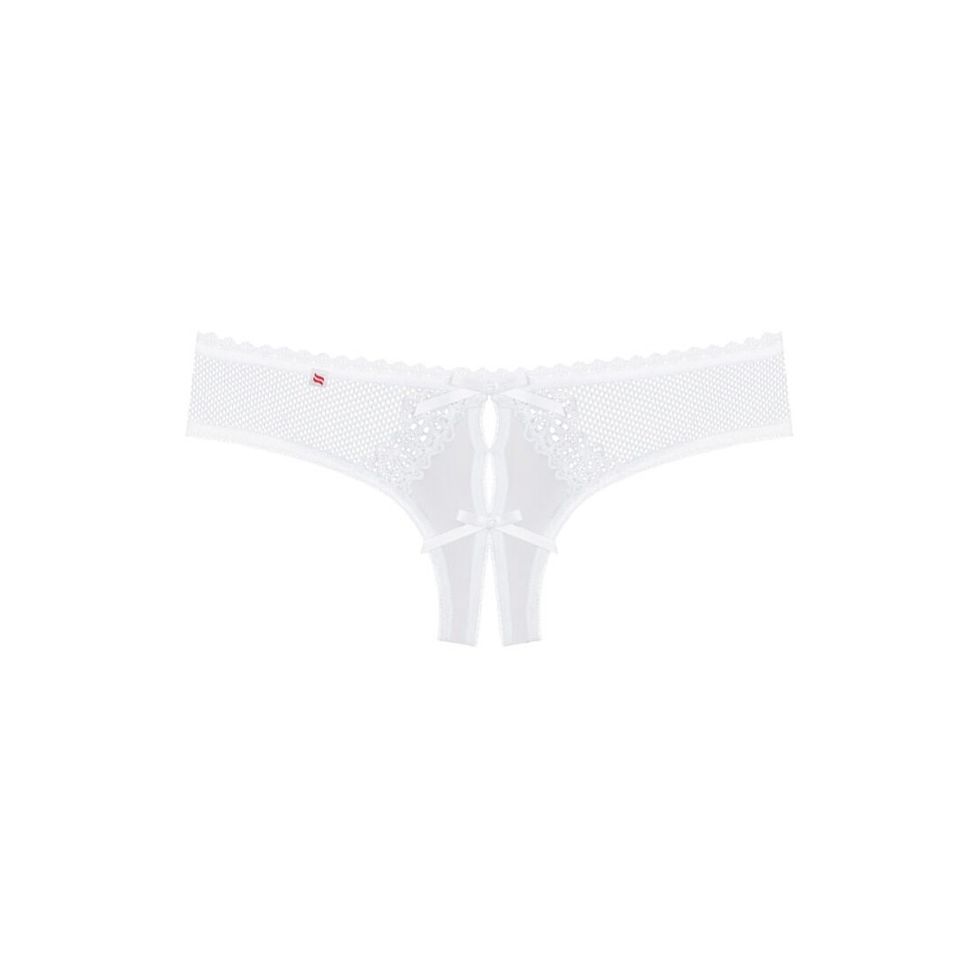 Perizoma bianco trasparente senza cavallo Alabastra di Obsessive, realizzato in delicato tulle, rete fine e dolce pizzo. Morbido ed elasticizzato su tutta la superficie per un comfort totale. Perizoma aperto sul davanti e decorato con fiocchi di raso.
