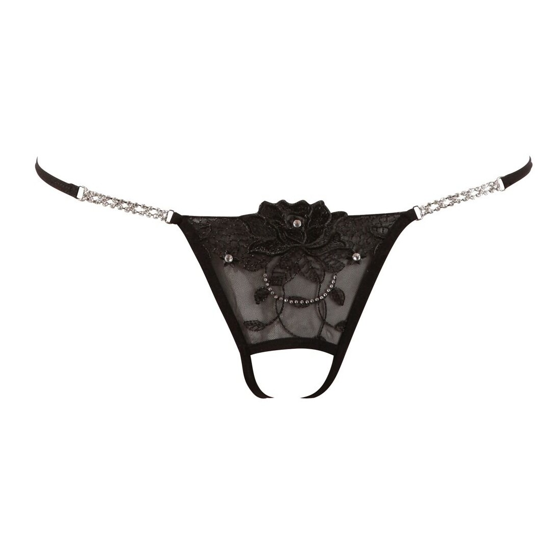 Nero, con ricami e pietre strass. Sul lato rispettivamente strass. Dietro piccola allacciatura. 100% poliestere.