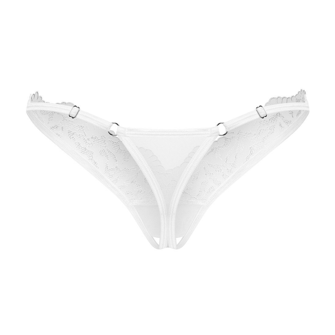 Bellissimo perizoma crotchless Arrowel di Obsessive in tulle bianco trasparente con pizzo sottile sul davanti. Morbido ed elastico per un alto livello di comfort. Invitante apertura sul cavallo.