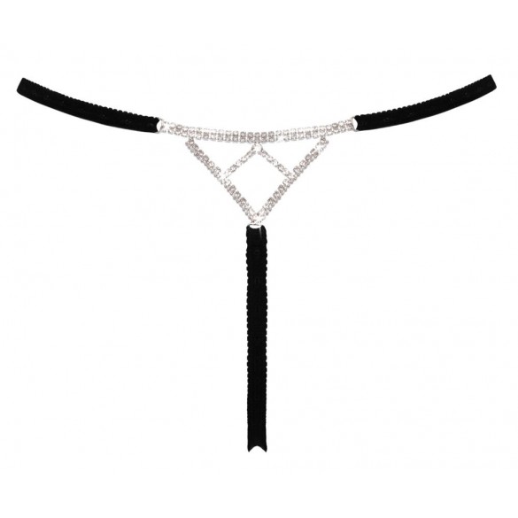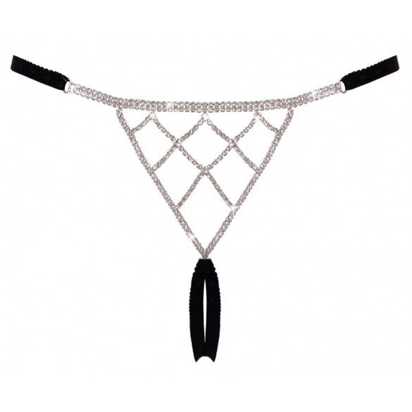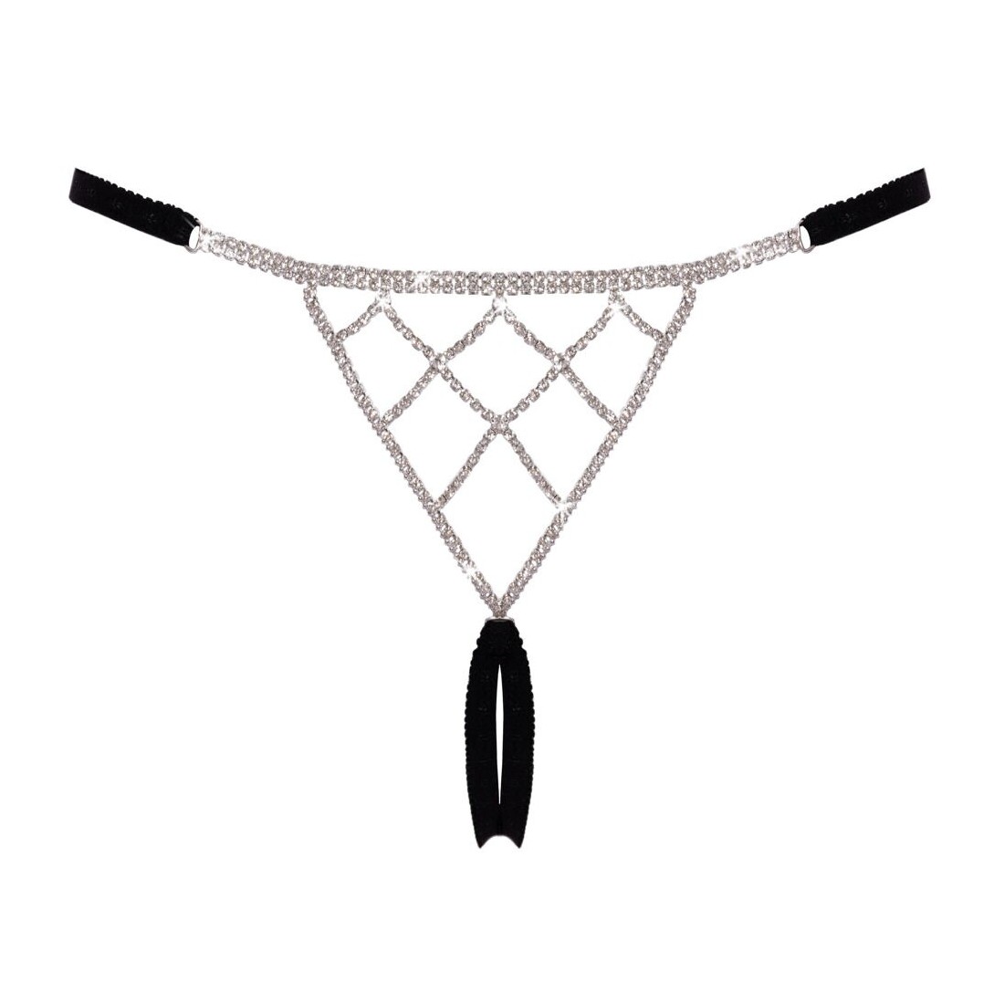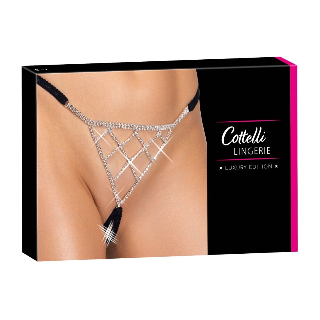 Lussuoso perizoma inguinale di Cottelli LINGERIE realizzato con morbide fasce elastiche nere e accessori color argento. La parte anteriore e il triangolo decorativo sul retro sono realizzati con innumerevoli strass scintillanti. Le cinghie elastiche ai lati della vita possono essere regolate per adattarsi. Seducente apertura sul cavallo.