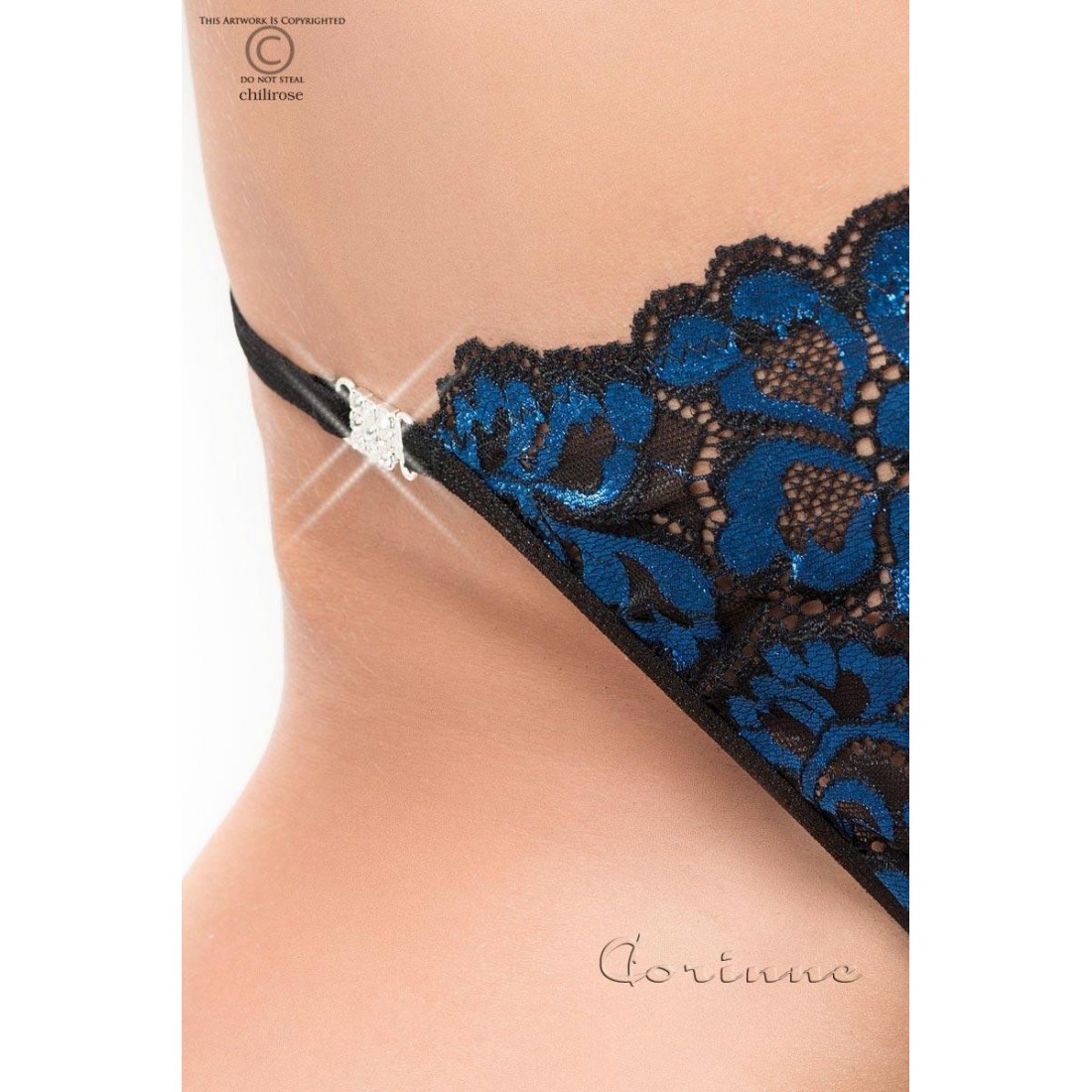 Un perizoma molto sensuale e fine decorato con dettagli floreali in un tessuto blu scuro lucido alternato a pizzo creando cos un effetto lussuoso.TAGLIA S/M.