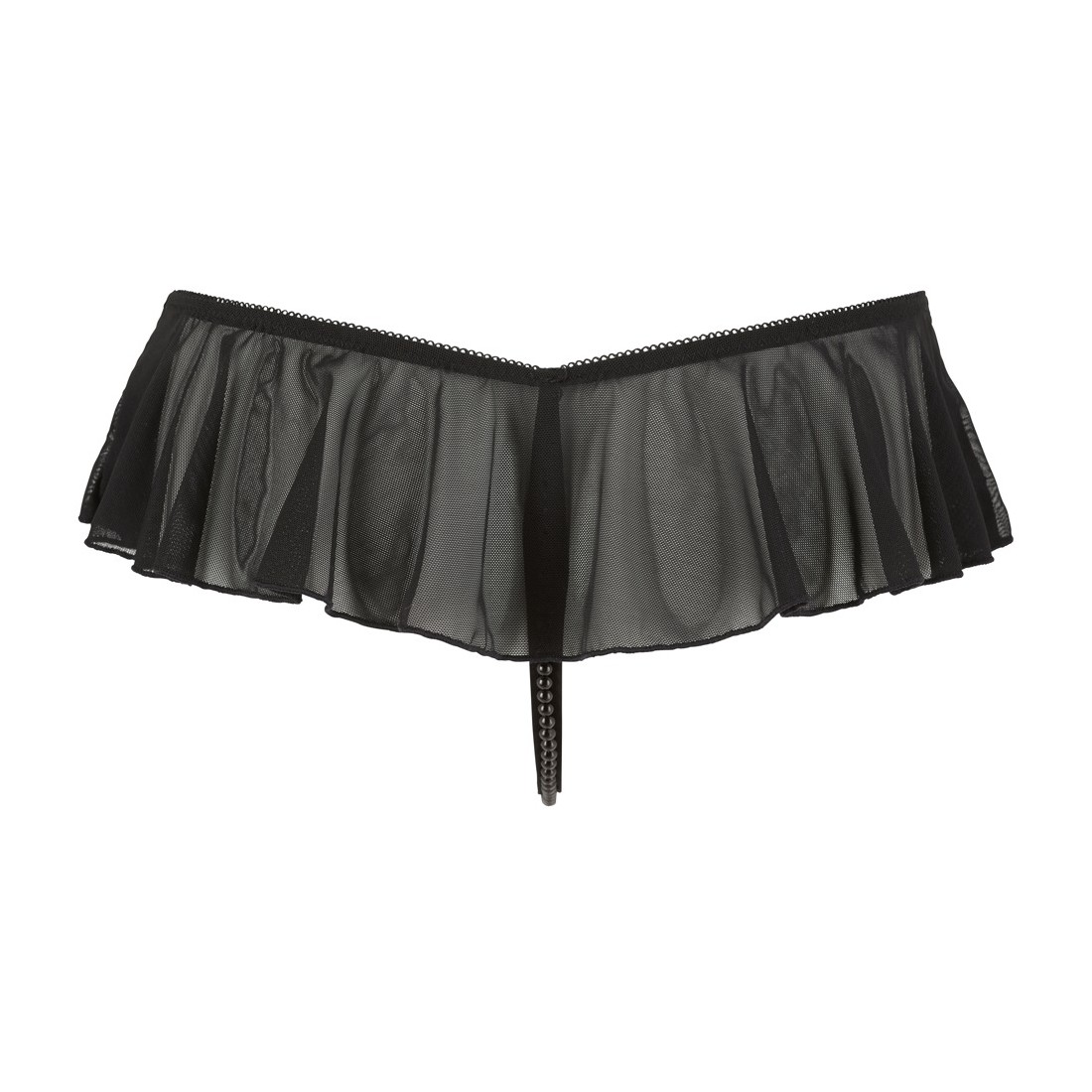 Sensuale perizoma ouvert con balze che valorizzano la figura e collana di perle nere attraverso il cavallo. Il pube aperto è lascivamente incorniciato da 2 nastri elastici.