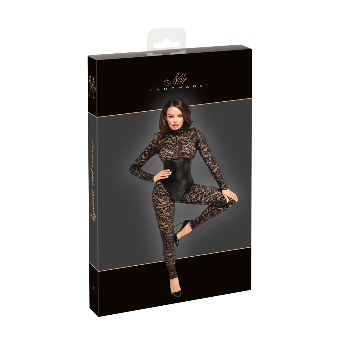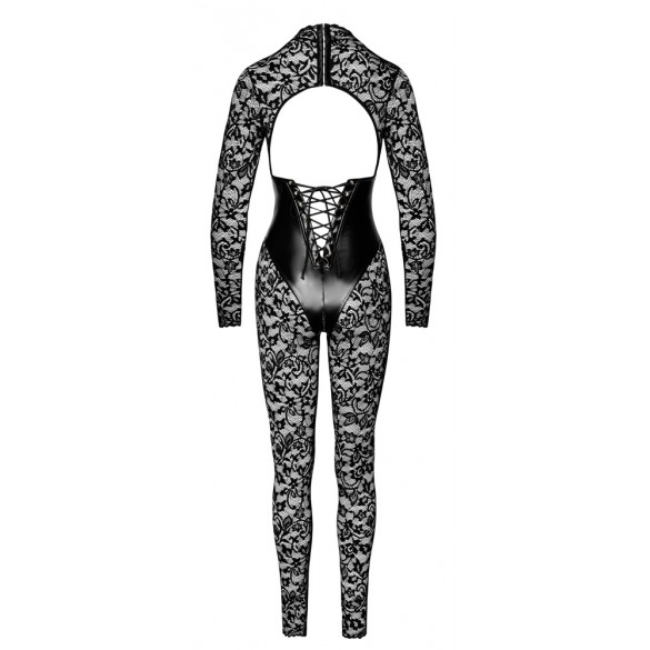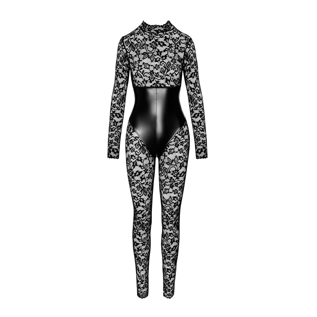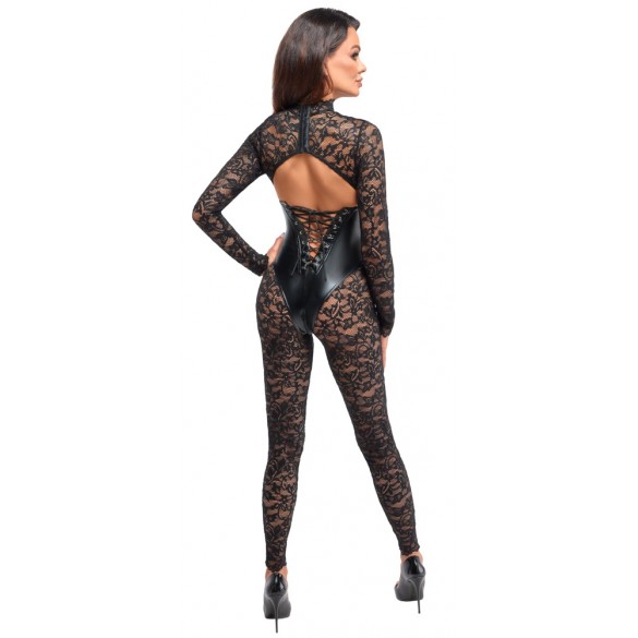 Accogliente tuta di Noir in pizzo morbido ed elasticizzato. Con maniche e gambe lunghe, scollo alto e piccolo collo alto. Con corsetto integrato senza busto in look powerwet. Allacciatura variabile decorativa sulla schiena aperta. Chiusura con gancio al collo e pratica zip al cavallo.