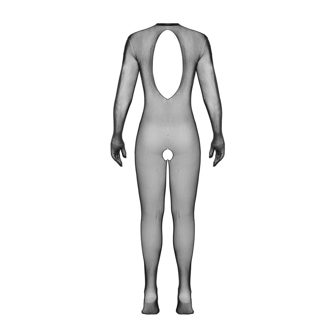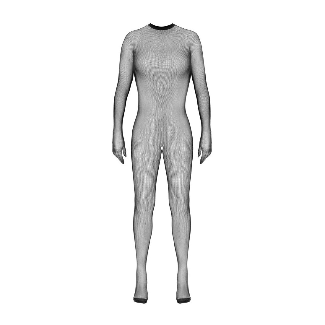 Catsuit nera crotchless in rete fine con guanti e piedi integrati S-L