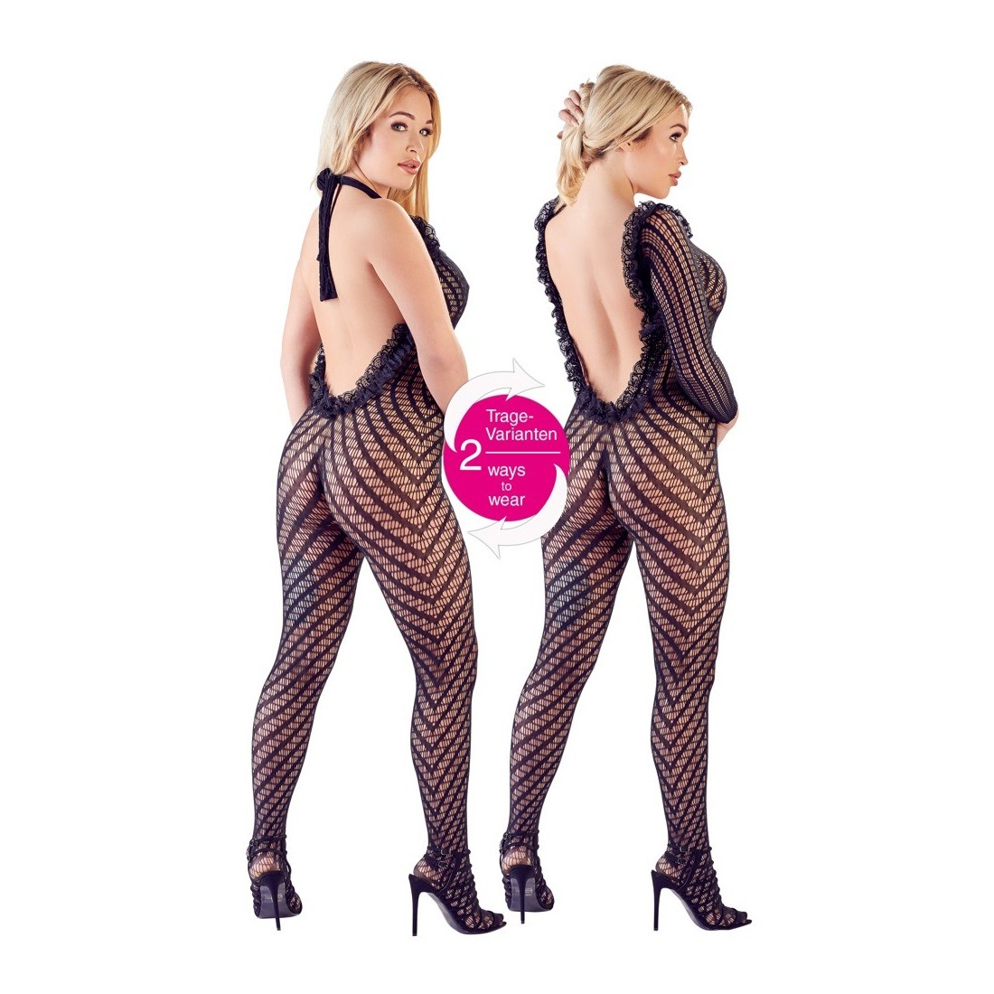 Maniche anche indossabili come scollo all'americana.Taglio e materiale: tuta senza cuciture realizzata in materiale elastico a rete con effetto rigato e volant in pizzo. con scollo molto basso e punta rinforzata. 94% poliammide 6% spandex.TAGLIA UNICA.