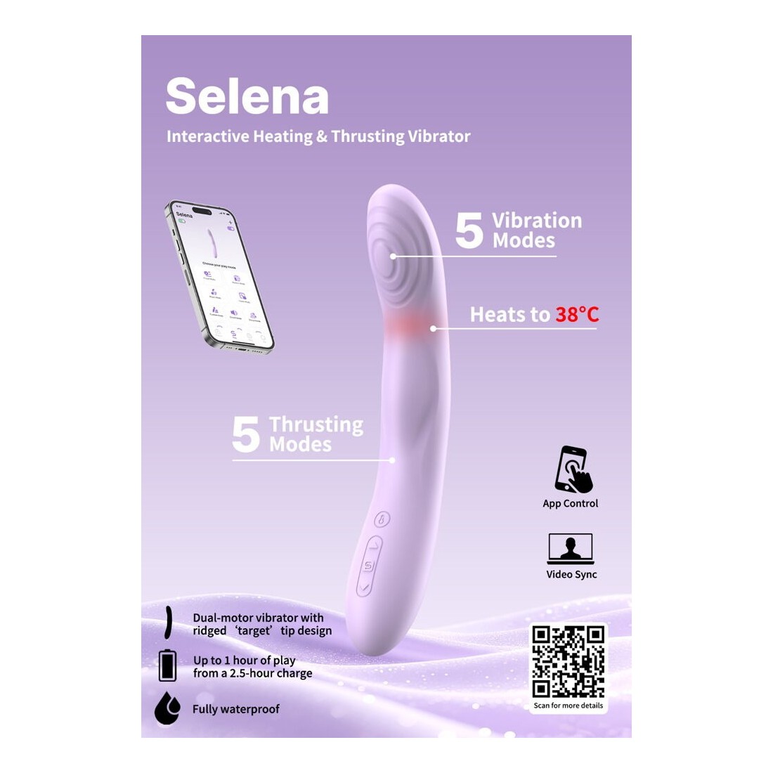 Il vibratore riscaldante e a spinta Selena di SVAKOM ha una forma ergonomica e curva. La sua testina appiattita combina vibrazioni intense con spinte sensuali per una stimolazione ritmica unica. Le delicate texture ondulate intensificano ulteriormente le sensazioni. La funzione riscaldante (fino a 38 °C) offre un piacere confortevole. È perfetto per la stimolazione mirata dei punti di piacere all'interno e all'esterno del corpo. In particolare, il punto G e il clitoride godranno di un massaggio intenso! Il vibratore in silicone morbido e setoso può essere utilizzato anche nella vasca da bagno e sotto la doccia perché è impermeabile.